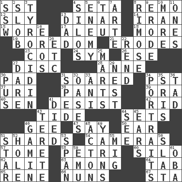 ACROSS 1. Fast jet (abbr.) 4. Bristle 8. San ____ (Riviera town) 12. Cunning 13. Middle Eastern gold or silver currency 14. SW Asia republic 15. Had on 17. Native American of Southwest Alaska 18. Greater amount 19. Mood resulting from idleness 21. Eats (away) 23. Small bed 24. Symbol (abbr.) 26. Compass dir. 27. Flat circle 28. Singer Murray 30. Writing tablet 31. Flew 34. Pacific Standard Time (abbr.) 37. RI univ. 38. Leg coverings 39. Mouth or opening 40. Elected rep. 41. Stop 42. To free from 43. Event that recurs at intervals 44. Puts into a specified state 46. Turn to the right 47. Declare 50. Hearing organ 51. Broken pieces 54. Devices for capturing images 57. Heavy book 58. _ dish (used to culture cells) 60. Grain storage tower 62. Set down 63. Amid 64. Bar bill 65. French philosopher Descartes 66. Religious women 67. R.R. building DOWN 1. Compass dir. 2. Oscar Madison type 3. Polypeptide antibiotic 4. Grain storage towers 5. Foe 6. The 19th letter of the Greek alphabet 7. Johnson of "Laugh-In" 8. Full of chinks, cracks, or crevices 9. Wear away 10. Female horse 11. Washington bills 13. Male parent 16. Greek god of love 20. And so on (abbr.) 22. Tear apart 25. Shops 27. Have the gumption 29. A home for chicks 30. Fluid product of inflammation 31. Drove too fast 32. Fertile tracts in a desert 33. Black tropical American cuckoo 34. Likenesses of persons 35. Indian titles of respect 36. Bit 41. Passed on 43. Cylindrical with tapered ends 44. Observe 45. Hearing organs 46. Homeless child 48. NE Massachussets city 49. Tall tales 51. Play the lead 52. Hollow 53. Connect, as a bridge 55. Russian fighter aircraft 56. Narrow board 59. Australian flightless bird 61. Chief or king in Benin or Nigeria