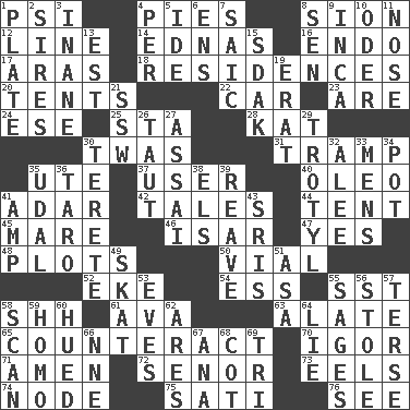 ACROSS 1. Air pressure measure (abbr.) 4. Sliced desserts 8. The Jewish people; Israel 12. Actor's bit 14. Ferber et al. 16. Inside; within (prefix) 17. Ancient river in northeast Turkey 18. Homes 20. Portable shelters 22. Automobile 23. "We ___ not amused" (Victoria) 24. Compass dir. 25. R.R. building 28. Krazy ___ of comics 30. It was, poetically 31. _____ steamer (cargo ship) 35. Shoshoni 37. One who makes use of a thing 40. Margarine 41. The sixth month of the Jewish calendar 42. Falsehoods 44. Portable shelter 45. Female horse 46. Austrian river, tributary to the Danube 47. Consenting reply 48. Schemes 50. Small bottle 52. Make supply last 54. Curvy letter 55. Fast jet (abbr.) 58. Quiet! 61. Actress Gardner 63. Having winglike extensions 65. Frustrate 70. Russian composer Stravinsky 71. So be it 72. Sir (Sp.) 73. Snakelike fish 74. Thickened enlargement 75. Suttee (variant) 76. Perceive with the eye DOWN 1. Food holder 2. Fathers 3. Lacking in sense or substance 4. For each 5. Binary compound 6. Followers of ems 7. Ketch in the Levant 8. Elected rep. 9. South American Indian 10. River in Europe 11. Sense of smell 13. Eastern Standard Time (abbr.) 15. Neighbor of Neb. 19. Part of Q.E.F. 21. Compass dir. 26. Strained 27. Slender Brazilian palm 29. TNT 30. Cylindrical with tapered ends 32. Toward shelter 33. Not women's 34. Cooking vessel 35. Hereditary estate 36. Pacific island yam 38. Raised railways 39. Break or tear apart 41. Electrical Unit 43. Indian titles of respect 49. Three-handed card game 51. White ___ sheet 53. Nights before holidays 55. Gurus 56. Fur scarf 57. Laconic 58. Skim 59. Like (prefix) 60. Became colored 62. Ancient Greek god of war 64. Whopper 66. Compass dir. 67. Santa ___, CA 68. Small bed 69. Three (prefix)
