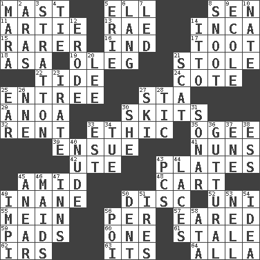 ACROSS 1. Vertical spar for supporting sails 5. Pipe bend 8. Elected rep. 11. Nick name for Arthur 13. Actress Charlotte 14. South American Indian 15. More valued for its uncommonness 16. Working for oneself (abbr.) 17. A blast of a horn 18. White ___ sheet 19. Cassini of fashion 21. Fur scarf 22. Event that recurs at intervals 24. ____ d'Azur (French Riviera) 25. Main course 27. R.R. building 29. Small Philippine buffalo 30. Burlesque acts 32. Monthly bill 33. Value system 35. Double curve, resembling the letter S 39. Follow as a consequence or result 41. Religious women 42. Shoshoni 43. Food holders 45. Among 48. Draw slowly or heavily 49. Empty; void 50. Compact _ 52. Single; one (prefix) 55. Count _ (2 wds.) 56. For each 57. Having ears or earlike features 59. Writing tablets 60. Single 61. Having lost freshness 62. Big collection agency 63. It is 64. Silent film actress Nazimova DOWN 1. Hindu Mythology: god of death 2. Ancient river in northeast Turkey 3. Ski resort town in Vermont 4. Neckwear 5. 4th largest of the Great Lakes 6. Austrian-born American filmmaker Fritz 7. Directed 8. Snob 9. Learning spot: Fr. 10. Nathan's nickname 12. Wear away 14. "Tell ____ the Marines!" 20. Area sheltered from the wind 21. Leave at once 23. Feeling or showing extreme anger 25. Ewer handle 26. Compass dir. 27. What Jean-Claude Killy likes to do 28. Nervous spasm 30. A female animal or person 31. Underwater navigation system 33. Eastern Standard Time (abbr.) 34. Third day of the wk. 36. From the throat 37. Compass dir. 38. Double-curved letter 40. Naked 43. Personal Computers (abbr.) 44. Shoestrings 45. Approach 46. Unmarried girls 47. Lodging establishments 49. Body of Kaffir warriors 50. Incision 51. Angers 53. 1994 drama film starring Jodie Foster 54. The main thing one is thinking about 56. Luau course 58. _ moment's notice (2 wds.)