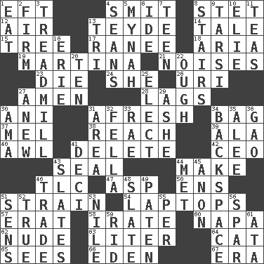 ACROSS 1. Bank Draft (abbr.) 4. Stricken, poetically 8. Proofreading order 12. Wind 13. Miss Universe 1986, Barbara Palacios _ 14. Lie 15. Family _ (genealogy) 17. The wife of a rajah (variant) 18. Operatic vocal solo 19. Chrissie's court nemesis 21. Annoying sounds 23. Pass on 24. A female animal or person 26. RI univ. 27. So be it 28. Straggles 30. Cuckoo 31. Anew 34. Paper or plastic container 37. Cartoonist voice _ Blanc 38. Arrive at 39. Insect wing 40. Leather borer 41. Keyboard key 42. Corporate head (abbr.) 43. Lick closed 44. Cause to be 46. Affectionate concern, for short 47. Cleo's killer 50. Followers of ems 51. Put through a sieve 54. Portable computers 57. Part of Q.E.F. 58. Feeling or showing extreme anger 60. California wine valley 62. Unadorned 63. 61 cubic inches 64. Feline 65. Perceives with the eye 66. Paradise 67. Epoch DOWN 1. Ingest 2. Not soft or yielding to pressure 3. Excercise machine 4. Seines 5. Non-adult bird? 6. Binary compound 7. Adolescent 8. Flight of steps 9. Tarsus (plural) 10. Writer Wiesel 11. Afternoon social gatherings 13. Three (prefix) 16. 4th largest of the Great Lakes 20. "___ Little Indians" 22. Ending for "Through" and "Enough" 25. Choose 27. Afresh 29. American tennis player Robert 30. Nursemaid (var.) 31. Length times width 32. Man or boy (slang) 33. Actress Charlotte 34. Keyboard key 35. Toward shelter 36. E Mali city 41. Tenth: prefix 43. Chalkboards 44. Was introduced to 45. Soon (poet.) 46. Swap 48. Schedule 49. Eucharist need 51. Elected reps. 52. Loyal 53. "Death on the ____" 55. For each 56. Practice fight 59. To free from 61. _ moment's notice (2 wds.)