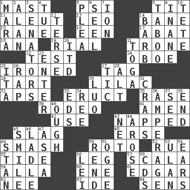 ACROSS 1. Vertical spar for supporting sails 5. Air pressure measure (abbr.) 8. Teat (slang) 11. Native American of Southwest Alaska 13. Lion 14. Object of repulsion 15. The wife of a rajah (variant) 16. Car or cant ending 17. Blind as ____ 18. Santa ___, CA 19. Monetary unit of Yemen 21. Marketplace scale 22. Trial 24. Mitch Miller's instrument 25. Pressed 27. Label 29. Small pie 30. Pale purple color 32. Domed church section 33. Spew [out] 35. Raze (variant) 39. Cowboy competition 41. So be it 42. Purpose 43. Slept 45. Volcanic refuse 48. Celtic language 49. Box-office sellout 50. Printing process, for short 52. Regret 55. Event that recurs at intervals 56. Part of a journey 57. Any of the three canals of the cochlea 59. Silent film actress Nazimova 60. Compass dir. 61. _ Allan Poe 62. Born 63. Binary compound 64. Elected reps. DOWN 1. Hindu Mythology: god of death 2. Actor Alda or Thicke 3. Legislators 4. Third day of the wk. 5. Entreaty 6. Sew up the eyelids of hawks and falcons 7. Electrically charged atom 8. Off limits 9. Empty; void 10. False hair 12. Laconic 14. Sharp remark 20. It would 21. Ancient Roman robe 23. Keyboard key 25. Call ___ day 26. Reproach for some lapse or misdeed 27. Nervous spasm 28. Keyboard modifier key 30. Nilotic language 31. Dice game 33. Begley and Asner 34. To sift 36. Electrical Measurement 37. Observe 38. Conclude 40. Ending for "Through" and "Enough" 43. Fish or hair follower 44. Came up 45. Grin 46. Dipping utensil 47. At sea 49. Comedian Laurel of Laurel & Hardy 50. Tear apart 51. Double curve, resembling the letter S 53. Uhlan (variant) 54. Hearing organs 56. Luau accessory 58. Music discs