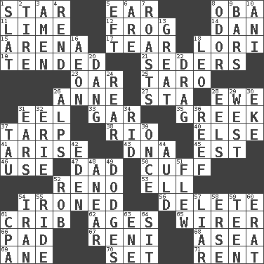 ACROSS 1. Play the lead 5. Ewer handle 8. Chief or king in Benin or Nigeria 11. Welles in "The Third Man" 12. Tree-dwelling hopper 14. Daniel's nick name 15. Sports stadium 17. Rend 18. Australian parrot (variant) 19. Watched over 21. Spring feasts 23. Boat paddle 25. Edible starchy tuberous root 26. Queen of England 1702-14 27. R.R. building 28. She-sheep 31. Snakelike fish 33. Slender fish 35. Hellenic 37. Canvas cover 38. River (Sp.) 40. Otherwise 41. Get up 43. Heredity factor (abbr.) 45. Eastern Standard Time (abbr.) 46. Purpose 47. Male parent 50. Sleeve end 52. Former U.S. Attorney General Janet 53. Pipe bend 54. Pressed 56. Erase 61. Baby bed with high sides 62. Eras 65. One who wires 66. Groovy apt. 67. Painter Guido (1575-1642) 68. Toward the sea 69. A saturated hydrocarbon 70. Arrange properly for use 71. Monthly bill DOWN 1. Narrow board 2. Become fatigued 3. So be it 4. Tear apart 5. Newt 6. "We ___ not amused" (Victoria) 7. Ridicules or criticizes harshly 8. Aroma 9. Drinking establishments 10. Cuckoo 13. Relatively large 16. A really long time 18. Lion 20. Mild oath, euphamism for damn 22. To draw with force 24. Tail end 26. High mountains 28. Snakelike fish 29. 270 degrees 30. Make supply last 31. Hearing organs 32. 4th largest of the Great Lakes 34. To free from 36. Coral ridge 37. The 19th letter of the Greek alphabet 39. At one time in the past 42. Paradise 44. Old (Scot.) 48. Approach 49. Evades 51. Soared 52. Director Reiner 54. SW Asia republic 55. Travel on or in a vehicle 57. One who doesn't tell the truth 58. Celtic language 59. Adolescent 60. Part of Q.E.F. 61. Numbers guy (abbr.) 63. Compass dir. 64. Be seated