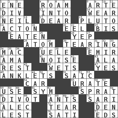 ACROSS 1. Compass dir. 4. Wander aimlessly 8. Johnson of "Laugh-In" 12. HTML Container Element 13. To the inside or interior of 14. Erode 15. Famous astronaut Armstrong 17. Letter starter 18. Greek god of the underworld 19. 13-14th century defensive garment 21. Snakelike fish 23. Altar cloth linen 24. Consumed 26. Slangy assent 28. Tiny particle 30. Separating forcefully 34. Big _ 37. Ubangi River tributary 39. Independent ruler or chieftain 40. Wet nurse (var.) 41. Annoying sound 43. Wing 44. Relief 46. Soaks 47. Affirmative reply 48. Short socks 51. Ketch in the Levant 54. 4-wheeled motor vehicle 55. A salt of uric acid 58. Purpose 61. Symbol (abbr.) 63. Small fatty European fish 65. A piece of turf (Scot.) 67. Pismires 71. Indian skirt 72. Actor Baldwin 73. Lacerate 74. Lair 75. For fear that 76. Suttee (variant) 77. Begley and Asner DOWN 1. Pulitzer Prize-winning author Ferber 2. Sibling's daughter 3. Webber/Rice musical 4. To free from 5. Single 6. "One Day ___ Time" 7. Greater amount 8. Leather borer 9. Reuben's nickname 10. Jacques of French films 11. Greek god of love 16. Globular water bottle used in Asia 18. Entreaty 20. Fish or hair follower 22. Sight organ 25. Part of speech 27. Before (prefix) 29. Catcalls? 30. Trials 31. "If ____ say so..." 32. The longest river in the world 33. Pate de foie ____ 34. Hindu Mythology: god of death 35. So be it 36. Keg 38. Untruth 42. He sold his birthright 45. Affectionate concern, for short 49. Compass direction 50. Attempt to accomplish something 52. Big collection agency 53. Smile enhancers 56. Barter 57. Having ears or earlike features 58. Allodial 59. Filth; sediment 60. Nights before holidays 62. Floor coverings 64. Metal containers 66. Sep. follower 68. Teachers' org. 69. Make lace 70. Indian title of respect (Mr.)