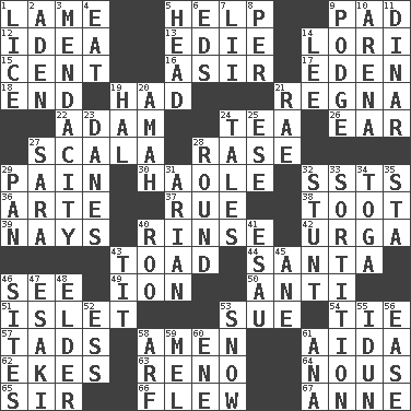 ACROSS 1. Unable to walk 5. Aid 9. Groovy apt. 12. The content of cognition 13. Singer Brickell 14. Australian parrot (variant) 15. Penny 16. SW Saudi Arabia district 17. Paradise 18. Conclusion 19. Possessed 21. Rain (Swedish) 22. First of billions? 24. Afternoon social gathering 26. Ewer handle 27. Any of the three canals of the cochlea 28. To erase 29. Ache 30. White Person, in Hawaii 32. Fast planes 36. Johnson of "Laugh-In" 37. Sorrow 38. A blast of a horn 39. Negative votes 40. Remove soap 42. Capital and largest city of Mongolia 43. Frog relative 44. Before Barbara or Clara 46. Observe 49. Electrically charged atom 50. Opposed to 51. Small island 53. Institute legal proceedings 54. Neckwear 57. Small boys 58. So be it 61. Opera by Verdi 62. Makes supply last 63. Western Nevada city 64. Good sense 65. Title for a knight 66. Soared 67. Singer Murray DOWN 1. Louse (plural) 2. Arabian gulf 3. Ananias' fault 4. Erode 5. Froth on beer 6. Begley and Asner 7. Cards in a Roman deck? 8. For each 9. Porridge 10. Sports stadium 11. Middle Eastern gold or silver currency 14. Area sheltered from the wind 19. Actor Linden 20. Nursemaid 21. Actress Charlotte 23. Natives or inhabitants of Denmark 24. Lies 25. Compass dir. 27. "Two Mules for Sister ____" 28. Unit of ammunition 29. Baking dish 31. Believer in; advocate of (suffix) 32. Difficult or unusual or dangerous feat 33. Determination 34. Ancient Roman robe 35. R.R. building 40. Friend of Pooh 41. Son of Isaac 43. Teat (slang) 45. A saturated hydrocarbon 46. Settings 47. 1973 Nobel Price Winner (Physics) Leo 48. A person who is older than you are 52. Curvy letter 53. Overwhelm 55. Goddess of spring and wife of Bragi 56. Relaxation 58. Sandy's bark 59. Cartoonist voice _ Blanc 60. Compass dir. 61. Santa ___, CA