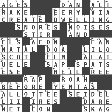 ACROSS 1. Matures 5. One of the 12 tribes of Israel 8. The first octave above the treble staff 11. Immoral or dissolute person 12. Suggestive of the supernatural 13. By way of 14. Cause to be 17. Home 19. Sounds asleep 21. Annoying sounds 22. Use a spoon 23. Added to 24. Raised railways 27. Period of immesurable duration 29. Air blower 32. Brizilian seaport 34. ___ good deed 36. _ and Stitch 37. Native of Scotland 38. Shade tree 39. Mountain range southwest of Kyrgyzstan 40. Ubangi River tributary 41. Plant excrement 42. Arguments over trivial matters 43. Compass dir. 44. Famous astronaut Armstrong 46. To riddle 47. Reproach for some lapse or misdeed 50. Wander 52. Prior to 55. Gossips 57. One to whom something is allotted 59. A glass for beer 62. Cards in a Roman deck? 63. Angers 64. Have the gumption 65. Was introduced to 66. A really long time 67. Heroin DOWN 1. Curve 2. Slender fish 3. Supplements with great effort 4. Actors Connery and Penn 5. Morning condensation 6. Sports stadium 7. High-strength synthetic material 8. Advice 9. Actor's bit 10. Labels 12. Begley and Asner 15. "_____ Recall" 16. One of the Great Lakes 18. Hat (slang) 20. Eats (away) 24. Follow as a consequence or result 25. Shoestrings 26. Fur scarf 28. Pitcher Ryan 29. Having threads 30. Having winglike extensions 31. Annoying sound 33. Had dinner 35. Electrical Unit 36. Pet locale 42. Schedule 45. Charged atoms 47. Friend of Pooh 48. Nick name for Arthur 49. Stone: prefix 51. Unmarried girls 52. Lip ointment 53. Writer Wiesel 54. Secret move to avoid paying debts 55. Consenting reply 56. Neighbor of Neb. 58. Car or cant ending 60. Period 61. Part of a journey