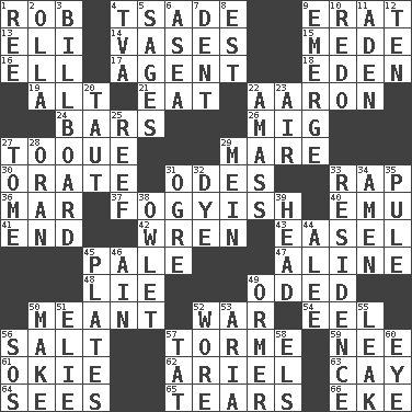 ACROSS 1. Director Reiner 4. Sadhe (variant) 9. Part of Q.E.F. 13. Biblical high priest 14. Flower holders 15. Ancient Persian 16. Pipe bend 17. Rep 18. Paradise 19. Keyboard modifier key 21. Erode 22. Composer Copland 24. Taverns 26. Russian fighter aircraft 27. Woman's close-fitting hat 29. Female horse 30. Declaim 31. Lyric poems 33. Strike 36. Spoil 37. Out of fashion; old fashioned 40. Australian flightless bird 41. Conclusion 42. Songbird 43. Artist's stand 45. Diluted with white 47. Place in a line 48. Untruth 49. Wrote a lyric poem 50. Intended 52. Armed conflict 54. Snakelike fish 56. Table seasoning 57. Singer Mel 59. Born 61. Migrant worker of the '30s 62. Satellite of Uranus 63. Island 64. Perceives with the eye 65. Pulls into pieces 66. Supplement with great effort DOWN 1. To separate or throw off 2. Rounded earthenware pot or jar 3. Big road sign 4. Federal power corp. 5. Gurus 6. Toward the sea 7. Gouge 8. Eastern Standard Time (abbr.) 9. Develop 10. Redecorate 11. Arabian gulf 12. "___ Little Indians" 20. Drawn tight 22. Collect or gather 23. Atmosphere 25. Coral collection 27. Heavy book 28. Northwest Algerian city 29. Chow _ 31. Legendary monster 32. Color 33. Dwelling 34. So be it 35. Whimper 38. A small or young owl 39. Froth on beer 44. Toward shelter 45. Food holders 46. The 18th letter of the Arabic alphabet 49. Abalone 50. Create 51. Writer Wiesel 52. Had on 53. Roberta Peters solo 55. Path through which fluid escapes 56. Mayday 57. Make lace 58. Raised railways 60. Sight organ