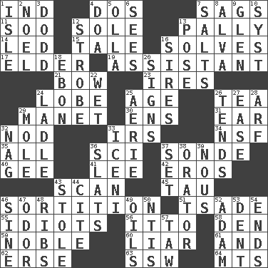 ACROSS 1. Working for oneself (abbr.) 4. Two (Sp.) 7. Settles 11. "Barney Miller" actor Jack 12. Not divided or shared with others 13. Friendly 14. Directed 15. Story 16. Finds the solution 17. A person who is older than you are 19. Helper 21. Ribbon knot 23. Angers 24. Ear part 25. Grow older 26. Beverage made from leaves 29. French painter Edouard 30. Followers of ems 31. Hearing organ 32. Lower and raise head in agreement 33. Big collection agency 34. Overdraft (abbr.) 35. Everything 36. _-fi 37. Something which is sent 40. Turn to the right 41. Area sheltered from the wind 42. Greek god of love 43. Examine hastily 45. The 19th letter of the Greek alphabet 46. Conclusion 51. Sadhe (variant) 55. Foolish or stupid persons 56. "Tell ____ the Marines!" 58. Lair 59. Having high moral qualities 60. One who doesn't tell the truth 61. Plus 62. Celtic language 63. Compass dir. 64. Mountains (abbr.) DOWN 1. Capri or Wright 2. Christmas carol 3. Texas town _ City 4. ___ good deed 5. Water jar 6. Observes 7. Table seasonings 8. Inventor's middle name 9. Small, secluded valley 10. System (abbr.) 12. Disco prop 13. Introduce or present, as a question 16. Begets 18. Inky black, to poets 20. Public displays of written messages 22. Soggy 24. Dipping utensil 25. Nest on high 26. Is inclined (to) 27. Comfort 28. Sandy's bark 29. Undercover agent 32. Tired old horse 33. Ancient Celtic tribe of eastern Britain 36. Narrow boards 37. Arrange properly for use 38. Speaker 39. Horse sense 43. Took without asking 44. Quote 46. Trig term 47. Aroma 48. Chest bones 49. Petroleums 50. Nuclear Threat Initiatives 52. First of billions? 53. Scratch 54. Conclusions 57. The 23rd letter of the Hebrew alphabet