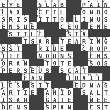 ACROSS 1. Sight organ 4. Broad, flat, thick piece 8. Ache 12. Not strict 13. To provide with a ceiling 14. Southwest Nigerian state 15. Indian titles of respect 17. "Tell ____ the Marines!" 18. "_ and Lucy" (Charlie Brown theme song) 19. Follow as a consequence or result 21. Corporate head (abbr.) 23. Compass dir. 24. Vertical member of a panel or frame 26. R.R. building 28. Russian ruler of old 30. Lacerating 34. Fast jet (abbr.) 37. Travel on or in a vehicle 39. Riding implement 40. Standoff 41. Parts of speech 43. Followers of ems 44. NW Algerian seaport 46. Lug 47. Mayday 48. Son of Zeus who helped slay Medusa 51. Jazz singing style 54. Avid follower 55. Distinguishing feature 58. French article 61. Be seated 63. Ferber et al. 65. Nick name for Arthur 67. Among 71. Table seasoning 72. Austrian river, tributary to the Danube 73. Yard entry 74. Born 75. Hiding places for outlaws 76. Connect, as a bridge 77. Eastern Standard Time (abbr.) DOWN 1. Otherwise 2. Tall tales 3. Be extant 4. _-fi 5. Allow 6. Small island 7. Group of countries in special alliance 8. Luau course 9. Queen of England 1702-14 10. Goddess of spring and wife of Bragi 11. Olfactory organ 16. Set of matching outer garments 18. Globular water bottle used in Asia 20. Raised railways 22. Compass dir. 25. Merit 27. Curve 29. Disturbances 30. Portable shelters 31. Angers 32. Words to Nanette 33. Global Positioning Systems (abbr.) 34. Constrict 35. The founder of a family 36. Separate forcefully 38. Superhero pair 42. Religious group 45. Science/research agcy. 49. Comfort 50. Corn or form start 52. "We ___ not amused" (Victoria) 53. Small boys 56. Lacking in sense or substance 57. Stories 58. Put down 59. Celtic language 60. Comedian Laurel of Laurel & Hardy 62. Labels 64. Proofreading order 66. Big collection agency 68. Atlas unit 69. Call ___ day 70. Lair