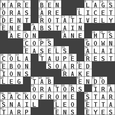 ACROSS 1. Female horse 5. Benjamin's nick name 8. Falls behind 12. Mouths or openings 13. "We ___ not amused" (Victoria) 14. It is permitted: Lat. 15. Incision 16. Rotating or pertaining to rotation 19. Compass dir. 20. Refrain by choice 21. A really long time 23. One (Scot) 24. Mountains (abbr.) 27. 911 reaches them 30. Long dress 31. Artist's stands 34. Jai ____ 35. Root beer relative 38. Grayish beige 40. State of inaction 41. Inky black, to poets 42. Flew 44. Charged particles 45. Immoral or dissolute person 46. Part of a journey 47. Bar bill 50. Inside; within (prefix) 53. Speakers 57. Lyricist Gershwin 59. Italian handbag shop? 63. Play the lead 64. Slow-paced one 65. Lion 66. Singer James 67. Canvas cover 68. Followers of ems 69. Snake ____ (dice throw) DOWN 1. Method 2. Sports stadium 3. Indian princess (variant) 4. Eastern Standard Time (abbr.) 5. Sharp remark 6. Greek god of love 7. Remaining after all deductions 8. 54 in ancient Rome 9. Adept person 10. Set 11. Filthy place 14. Actor's bit 17. Auto club (abbr.) 18. Metal container 20. Small Philippine buffalo 22. Seas 24. Undercover agent 25. It was, poetically 26. In a ____ (agitated or irritated) 28. Pacific Standard Time (abbr.) 29. Oceans 30. Place where plants grow 32. Nilotic language 33. Coast Guard woman 35. To provide with a ceiling 36. Mitch Miller's instrument 37. Yearn 39. Epoch 43. Supplements with great effort 47. Utensil 48. Sandy's bark 49. Tavern 51. Short, simple song 52. Speak pompously 54. Lacquered or enameled metalware 55. Sign of things to come 56. Vintage cars 58. Ancient river in northeast Turkey 59. Fast jet (abbr.) 60. Santa ___, CA 61. Automobile 62. Monetary unit of Laos 63. Observe