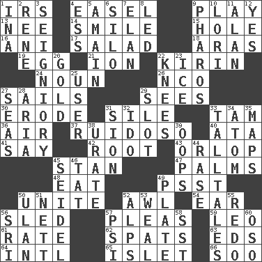 ACROSS 1. Big collection agency 4. Artist's stand 9. Live dramatic performance 13. Born 14. Grin 15. Opening into or through something 16. Black tropical American cuckoo 17. First course 18. Caspian sea tributary 19. Ovum 21. Electrically charged atom 22. Japanese brewing company 24. Part of speech 26. Non-commissioned officer (abbr.) 27. Travel by water 29. Perceives with the eye 30. Eat (away) 31. Drop; flow; fall 33. Scottish cap 36. Atmosphere 37. Noisy, rowdy, vocal (Spanish) 40. "One Day ___ Time" 41. Declare 42. Carrot, for example 43. Fourth or lowest deck 45. Comedian Laurel of Laurel & Hardy 47. Insides of hands 48. Ingest 49. Inconspicuous attention getter 50. Join together 52. Leather borer 54. Ewer handle 56. Downhill vehicle 57. Entreaties 59. Lion 61. Pace 62. Arguments over trivial matters 63. Begley and Asner 64. International (abbr.) 65. Small island 66. "Barney Miller" actor Jack DOWN 1. _ tizzy (2 wds.) 2. French philosopher Descartes 3. Signiory (variant) 4. Double-curved letter 5. With great haste 6. Grain storage tower 7. Style 8. Directed 9. N Egypt peninsula 10. Australian parrot (variant) 11. ____ Jay Lerner 12. It is so 20. Precious metal 22. Leg joints 23. Frozen water 25. One who uses or employs something 27. Oceans 28. Roberta Peters solo 29. Groove 31. The Jewish people; Israel 32. Wedding promise 33. Baron Munchausen's specialties 34. Tiny particle 35. Atlas contents 38. A salt of uric acid 39. I made a mistake 44. To erase 45. A glass for beer 46. Make lace 49. Food holder 50. ____ Bator 51. Remaining after all deductions 52. High mountains 53. Welt 55. Do over again 56. Indian title of respect (Mr.) 57. 23rd letter of the Greek alphabet 58. Fast jet (abbr.) 60. Bear (Spanish)