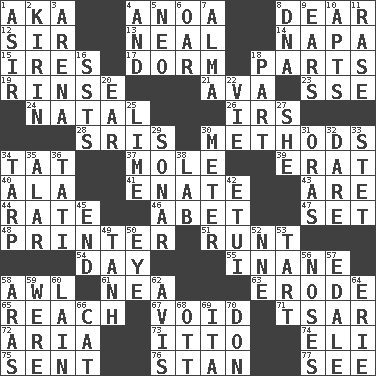 ACROSS 1. Alias (abbr.) 4. Small Philippine buffalo 8. Letter starter 12. Title for a knight 13. Anneal 14. California wine valley 15. Angers 17. Dormintory (informal) 18. Components 19. Remove soap 21. Actress Gardner 23. Compass dir. 24. Relating to or accompanying birth 26. Big collection agency 28. Indian titles of respect 30. Modes 34. Make lace 37. Undercover agent 39. Part of Q.E.F. 40. Chicken ___ king 41. Related on the mother's side 43. "We ___ not amused" (Victoria) 44. Assign a rank or rating to 46. Collude with 47. Arrange properly for use 48. Hard copy producer 51. The smallest animal of a litter 54. 24 hours 55. Lacking in sense or substance 58. Leather borer 61. Teachers' org. 63. Wear away 65. Arrive at 67. Nothingness 71. Russian ruler of old 72. Roberta Peters solo 73. "Tell ____ the Marines!" 74. Biblical high priest 75. Posted 76. Comedian Laurel of Laurel & Hardy 77. Observe DOWN 1. SW Saudi Arabia district 2. Japanese brewing company 3. Sports stadium 4. Plus 5. Modern: prefix 6. Boat paddle 7. _ mater 8. Heredity factor (abbr.) 9. Hearing organs 10. Tenement units (abbr.) 11. To erase 16. Fast planes 18. Role in a play 20. Hearing organ 22. Compete 25. Welles in "The Third Man" 27. A female animal or person 29. Echolocation 30. Distance measurement 31. Mouths or openings 32. Have the gumption 33. Proofreading order 34. Canvas cover 35. Having or resembling wings 36. Jacques of French films 38. Experiment locale 42. Needle holder 45. Conclude 49. Hyperbolic tangent 50. Sight organ 52. Compass dir. 53. Small pie 56. Olfactory organs 57. Peak District village in England 58. Caspian sea tributary 59. Past tense of be (plural) 60. (Had) reclined 62. Advice 64. One of the Great Lakes 66. Domesticated feline 68. Baseball player Mel 69. Call ___ day 70. Spanish title