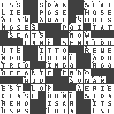 ACROSS 1. Curvy letter 4. Neighbor of Neb. 8. Narrow board 12. Falsehood 13. Introduce or present, as a question 14. Flexible conduit 15. ____ Jay Lerner 17. Of or related to the anus 18. Imelda's hoard 19. Olfactory organs 21. Luau course 23. Make lace 24. Theater features 26. At this time 28. Unable to walk 30. Legislator 34. Shoshoni 37. "Tell ____ the Marines!" 39. French philosopher Descartes 40. Dreamland 41. One or ones belonging to thee 43. Say or write further 44. Musical group of three 46. Southeast Asian peninsula 47. Friend of Pooh 48. Pertaining to the sea 51. Inside; within (prefix) 54. To free from 55. Underwater navigation system 58. Eastern Standard Time (abbr.) 61. Chop off 63. Nest on high 65. Desist 67. Residence 71. Portico 72. San ____ (Riviera town) 73. Austrian river, tributary to the Danube 74. It is 75. United States Postal Service (abbr.) 76. Globular water bottle used in Asia 77. Compass dir. DOWN 1. Liveliness 2. Grain storage towers 3. Gospel singer Marvin 4. Health resort 5. Spanish title 6. White ___ sheet 7. Seaweed 8. Quiet! 9. Plunder 10. Toward the sea 11. Trial 16. Actress Patricia 18. The Jewish people; Israel 20. R.R. building 22. Single 25. Stricken, poetically 27. Armed conflict 29. Principle of right and wrong 30. Message 31. Rend 32. Southwest Nigerian state 33. Make new 34. To (old English) 35. Torque (variant) 36. Singer Brickell 38. Metal container 42. Immeasurably long periods of time 45. Boat paddle 49. "Death on the ____" 50. Wedding promise 52. ___ good deed 53. Singles 56. Nick name for Arthur 57. Disturbances 58. Shade of tan 59. Observes 60. Pack (down) 62. Silvers or Donahue 64. Comfort 66. Mayday 68. Bear (Spanish) 69. Floor protector 70. Epoch