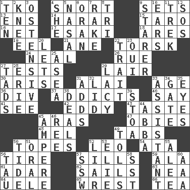 ACROSS 1. Ring climax 4. Derisive sound 9. Arranges properly for use 13. Followers of ems 14. Ethiopian city, capital of Harari 15. Edible starchy tuberous root 16. Fish or hair follower 17. 1973 Nobel Price Winner (Physics) Leo 18. Ancient Greek god of war 19. Snakelike fish 21. One (Scot) 22. Cod relative 24. Anneal 26. Sorrow 27. Trials 29. Den 30. Get up 31. Mountain range southwest of Kyrgyzstan 33. Ripen 36. HTML Container Element 37. Inveterate users 40. Declare 41. Observe 42. Whirlpool 43. Clothes sense 45. Ancient river in northeast Turkey 47. Off-Broadway awards 48. Cartoonist voice _ Blanc 49. Bar bills 50. Drinks excessively 52. Lion 54. _ moment's notice (2 wds.) 56. Become fatigued 57. Beverly of Met fame 59. Wing 61. The sixth month of the Jewish calendar 62. Travel by water 63. Teachers' org. 64. Ubangi River tributary 65. Take or capture by force 66. Afternoon social gathering DOWN 1. Nine, plus one 2. Leg joint 3. Clearly or manifestly demonstrative 4. A female animal or person 5. Rhinal 6. Northwest Algerian city 7. Immoral or dissolute person 8. Three (prefix) 9. A viewer who gazes fixedly 10. Hearing organs 11. Long journey 12. Mayday 20. Allows 22. Distinguishing feature 23. Fr. "Yes" 25. Toward the sea 27. Bits 28. One of the Great Lakes 29. Made of lace 31. Does sums 32. Hat (slang) 33. Helper 34. Yard entry 35. Sight organs 38. Allots cards 39. Portico 44. Swedish rock group 45. Electrical Unit 46. To riddle 49. For Whom the Bell _____ 50. Event that recurs at intervals 51. Spoken 52. One who doesn't tell the truth 53. Writer Wiesel 55. Toward shelter 56. The 19th letter of the Greek alphabet 57. Compass dir. 58. Fast jet (abbr.) 60. American Automobile Association (abbr.)