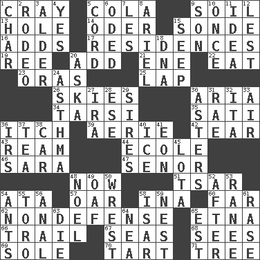 ACROSS 1. Supercomputer manufacturer 5. Root beer relative 9. The visible part of the earth's surface 13. Hollow 14. River in Europe 15. Something which is sent 16. Sums up 17. Homes 19. To riddle 20. Say or write further 21. Compass dir. 22. Ingest 23. Mouths or openings 25. Infant locale 26. Atmospheres 30. Roberta Peters solo 34. Tarsus (plural) 35. Suttee (variant) 36. Hankering 39. Nest on high 42. Separate forcefully 43. 480, 500 or 516 sheets of paper 44. Learning spot: Fr. 46. "Two Mules for Sister ____" 47. Sir (Sp.) 48. At this time 51. Russian ruler of old 54. _ moment's notice (2 wds.) 57. Rowing implement 58. _ tizzy (2 wds.) 60. At a great distance 62. Unrelated to defense, as in spending 65. Inactive volcano in Sicily 66. Drop behind 67. Oceans 68. Observes 69. Not divided or shared with others 70. Small pie 71. Woody plant DOWN 1. Burn to charcoal 2. Cowboy competition 3. Tree or shrub in the Birch family 4. Consenting reply 5. Drawstring 6. Wrote a lyric poem 7. French article 8. Satellite of Uranus 9. Manchild 10. At one time in the past 11. The main thing one is thinking about 12. For fear that 15. Ooze 18. Heredity factor (abbr.) 20. "____ silly question..." 24. Respiratory problem 27. Lyricist Gershwin 28. Compass dir. 29. Titles for men of rank and authority 30. Michaelmas daisies 31. Actress Charlotte 32. Call ___ day 33. Wind 36. Big collection agency 37. Afternoon social gathering 38. Auto 40. Frozen water 41. Period of immesurable duration 45. Globular water bottle used in Asia 48. Christmas carol 49. Clumsy lout 50. Obtain by seizing forcibly or violently 52. Following 53. The wife of a rajah (variant) 54. Pismires 55. "Corrida" creature 56. Of or related to the anus 58. Austrian river, tributary to the Danube 59. Egg locale 61. Raze (variant) 63. Expire 64. Teachers' org. 65. Eastern Standard Time (abbr.)