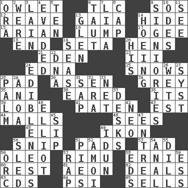 ACROSS 1. A small or young owl 6. Affectionate concern, for short 9. Mayday 12. Break or tear apart 13. Greek goddess of the earth (variant) 14. Flintstone garb 15. Believer in; advocate of (suffix) 16. Mass 17. Double curve, resembling the letter S 18. Conclude 19. Bristle 20. Coop moms 21. Genesis locale 23. One more than two 24. Pulitzer Prize-winning author Ferber 25. Frozen precipitation (plural) 28. Writing tablet 30. NE Netherlands city 34. Jennifer or Joel 35. Black tropical American cuckoo 36. Having ears or earlike features 38. ___ a Wonderful Life 39. Ear part 41. Eucharist need 43. Eastern Standard Time (abbr.) 44. Shopping centers 46. Observes 48. Biblical high priest 49. Image 50. Clip 51. Writing tablets 53. Small boy 56. Margarine 57. Tall New Zealand timber tree 58. Bert's buddy 60. Respite 61. Period of immesurable duration 62. Allots cards 63. Music discs 64. 23rd letter of the Greek alphabet 65. Exchanges for money DOWN 1. Mouth or opening 2. Past tense of be (plural) 3. (Had) reclined 4. Eluded 5. "___ Little Indians" 6. Tense 7. Pale green bean 8. Head covering 9. Seigniories (variant) 10. Lyric poems 11. Perceive with the eye 13. Small, secluded valley 14. Weeding 19. Gospel singer Marvin 20. Part of HMS, perhaps 22. Heredity factor (abbr.) 24. The property of being fit to eat 26. Moistens 27. System (abbr.) 28. Inside of hand 29. Small Philippine buffalo 31. Plant excrement 32. Epoch 33. Fish or hair follower 37. Writing tables 40. American author Paul (1891-1958) 42. Modern: prefix 45. Small drink 47. Main course 49. Goddess of spring and wife of Bragi 50. Downhill vehicle 51. Sliced desserts 52. Mine, in Marseilles 54. Of or related to the anus 55. Deli pickle 56. The grampus (Milton) 57. Hit sharply and swiftly 58. Begley and Asner 59. Double-curved letter