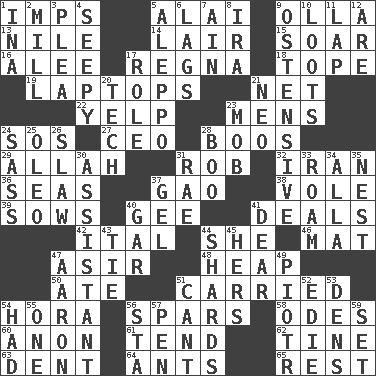 ACROSS 1. Naughty children 5. Mountain range southwest of Kyrgyzstan 9. Spanish pot 13. "Death on the ____" 14. Den 15. Fly high 16. Toward shelter 17. Canadian anthropologist Darnell 18. Drink excessively 19. Portable computers 21. Fish or hair follower 22. Sharp bark 23. Not women's 24. Distress signal 27. Corporate head (abbr.) 28. Scornful sounds 29. Assad's deity 31. Director Reiner 32. SW Asia republic 36. Oceans 37. E Mali city 38. Grand slam 39. Sty mamas 40. Turn to the right 41. Allots cards 42. Slanted text style (abbr.) 44. A female animal or person 46. Floor covering 47. SW Saudi Arabia district 48. Pile 50. Had dinner 51. Borne 54. Israeli folk dance 56. Practice fights 58. Lyric poems 60. Soon (poet.) 61. Look after 62. Prong on a fork 63. Scratch 64. Pismires 65. State of inaction DOWN 1. _ tizzy (2 wds.) 2. Place where flour is made 3. Entreaty 4. Not well drained, as in land 5. City in Syria 6. Falls behind 7. The 18th letter of the Arabic alphabet 8. Retirement account (abbr.) 9. Clearly or manifestly demonstrative 10. Plunders 11. Pet locale 12. "We ___ not amused" (Victoria) 17. Hero or heavy, e.g. 20. Technical work 21. Modern: prefix 23. Disorderly crowd 24. Backtalk 25. Butter sub 26. Cole _ (cabbage dish) 28. Surprise greeting 30. Aide 31. Actress Charlotte 33. Wander aimlessly 34. Silent film actress Nazimova 35. A home for chicks 37. Set 40. Slender fish 41. Letter starter 43. Standoff 44. Broken pieces 45. Possessive pronoun 47. Composer Copland 49. Peter (Polish) 51. Patter 52. Singer Brickell 53. Lairs 54. Possessed 55. Single 56. R.R. building 57. Animal enclosure 59. Put into a specified state