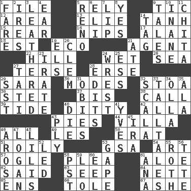 ACROSS 1. Do some clerical work 5. Trust 9. Nervous spasm 12. Type of rug 13. Writer Wiesel 14. Hyperbolic tangent 15. Rump 16. Cuts off 17. Mountain range southwest of Kyrgyzstan 18. Eastern Standard Time (abbr.) 19. Environmental prefix 21. Representative 22. Land elevation 24. Dripping 26. Ocean 27. Laconic 28. Celtic language 29. "Two Mules for Sister ____" 30. Methods 32. Portico 36. Proofreading order 37. Twice 38. Give a ring to 39. Event that recurs at intervals 40. Simple song 42. Silent film actress Nazimova 43. Sliced desserts 44. Country estate 46. 100% 49. French article 50. Part of Q.E.F. 51. Agitated, as a liquid 53. Girls' org. (abbr.) 54. Nonscientific branch of learning 57. Stare at amorously 58. Entreaty 61. Medicinal plant 62. Alleged 63. Ooze 64. Remaining after all deductions 65. Followers of ems 66. Lacquered or enameled metalware 67. American tennis player Robert DOWN 1. Conductor's collection 2. Angers 3. Tough but pliablecoriaceous 4. Hearing organ 5. Former U.S. Attorney General Janet 6. Biblical high priest 7. Mouth edge 8. It is so 9. Lies 10. Lacking in sense or substance 11. Riviera of "Kiss of the Spider Woman" 14. Label 19. Raised railways 20. Clement's nick name 21. Had dinner 23. Feeling or showing extreme anger 24. Take or capture by force 25. Double-curved letter 27. Jacques of French films 28. Proofreads 29. Fast jet (abbr.) 31. Off-Broadway awards 32. Any of the three canals of the cochlea 33. Baron Munchausen's specialties 34. Spanish pot 35. According to 40. Pass on 41. Jacques Cousteau's middle name 43. Strand of rope, yarn or thread 45. Retirement account (abbr.) 46. Came up 47. Utah city north of Ogden 48. Ms. Damita and namesakes 52. Directed 53. Stare wonderingly 55. Writer of Portnoy's Complaint (1969) 56. Wig 58. Pacific Standard Time (abbr.) 59. Lion 60. Snakelike fish 61. Santa ___, CA