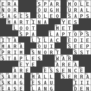 ACROSS 1. Epoch 4. Practice fight 8. Undercover agent 12. Not either 13. Ending for "Through" and "Enough" 14. Mountain range 15. Gurus 18. Margarine 19. Plant excrements 20. Chrissie's court nemesis 22. Affirmative reply 23. Spoils 24. Was introduced to 25. Health resort 26. Portable computers 30. Call ___ day 33. Pale purple color 36. Singer Brickell 37. Hindu Mythology: god of death 39. Fr. "Yes" 40. Ooze 41. Demure 42. Derisive sound 44. Fast jet (abbr.) 45. Paper fasteners 47. Armed conflict 50. Sight organ 51. Length times width 53. "We ___ not amused" (Victoria) 54. Substance 57. "Two Mules for Sister ____" 59. Shopping center 61. Spanish missionary in California 63. Heroin 64. Son of Isaac 65. One more than two 66. Comfort 67. Austrian-born American filmmaker Fritz 68. Lair DOWN 1. Followers of ems 2. Wander 3. Therefore, facetiously 4. Within a short period 5. Monetary unit of Botswana 6. Grow older 7. 17th letter of the Greek alphabet 8. French bagpipes 9. Mouths or openings 10. Pet locale 11. Raised railways 16. Greek god of love 17. Halt 21. Slanted text style (abbr.) 22. Slangy assent 24. Big _ 26. Den 27. Lyric poems 28. Sliced desserts 29. Back-to-school mo. 30. Naughty children 31. Small pie 32. Operatic vocal solo 34. Charged atoms 35. Nilotic language 38. Electrical Measurement 42. Perceive with the eye 43. It was, poetically 46. Potassium hydroxide 48. Ancient Greek god of war 49. French philosopher Descartes 52. Bitter 53. Caspian sea tributary 54. Flair 55. Snaillike creature with no shell 56. 4th largest of the Great Lakes 57. Compass dir. 58. Alias (abbr.) 59. Cartoonist voice _ Blanc 60. White ___ sheet 62. The 18th letter of the Arabic alphabet