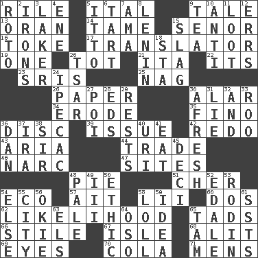 ACROSS 1. Cause heat under the collar 5. Slanted text style (abbr.) 9. Story 13. NW Algerian seaport 14. Docile 15. Sir (Sp.) 16. Puff or smoke 17. Interpreter 19. Single 20. Small child 21. Call ___ day 22. ___ a Wonderful Life 23. Indian titles of respect 25. Tired old horse 26. Some stationery 30. Having or resembling wings 34. Eat (away) 35. A pale, very dry sherry 36. Compact _ 39. Come out of 42. Do over again 43. Roberta Peters solo 44. Exchange 46. Drug cop 47. Locates 48. Sliced dessert 51. "Mermaids" star 54. Environmental prefix 57. Small island 58. Cards in a Roman deck? 60. Two (Sp.) 62. Odds 65. Bits 66. Vertical member of a panel or frame 67. Capri or Wright 68. Set down 69. Snake ____ (dice throw) 70. Root beer relative 71. Not women's DOWN 1. Printing process, for short 2. Metal shackles 3. Member of a famous L.A. basketball team 4. Compass dir. 5. "Tell ____ the Marines!" 6. Small pie 7. Nanny (var.) 8. Soviet premier 1918-24 9. Beverage made from leaves 10. Opposed to 11. Spoils 12. Blunders 15. Volcanic refuse 18. R.R. building 20. Russian ruler of old 24. Medicinal drug used to evoke vomiting 27. Luau course 28. Begley and Asner 29. Musical pauses 30. Anew 31. Falsehood 32. Added to 33. Friend of Pooh 36. One of the 12 tribes of Israel 37. Retirement account (abbr.) 38. Title for a knight 40. RI univ. 41. Ingest 45. Tenth: prefix 48. Diluted with white 49. One more than two 50. Principle of right and wrong 52. Peak District village in England 53. "The Thinker" sculptor 54. Otherwise 55. Municipality 56. Migrant worker of the '30s 58. Hang loosely or laxly 59. The content of cognition 61. Fast planes 63. Raised railways 64. Bear (Spanish) 65. Scottish cap