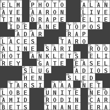 ACROSS 1. Shade tree 4. Picture 9. Actor Alda or Thicke 13. "___ Maria" 14. Composer Copland 15. Moving, as bait 16. Shallow baking pan 17. Window treatment 18. Writer Wiesel 19. Binary compound 21. A saturated hydrocarbon 22. Traditional theme or motif 24. The sixth month of the Jewish calendar 26. Hit sharply and swiftly 27. Shoestrings 29. Pacific island yam 30. Place in a line 31. Indian skirt 33. Friend of Pooh 36. Being at a high temperature 37. Short socks 40. Biblical high priest 41. Marina Del _, California 42. Yard entry 43. Artist's stand 45. Snaillike creature with no shell 47. Goodbye (Sp.) 48. Layer 49. Downhill vehicle 50. Tarsus (plural) 52. Auto club (abbr.) 54. Fish or hair follower 56. Ear part 57. Join together 59. Modern: prefix 61. Among 62. "The Thinker" sculptor 63. 4-wheeled motor vehicle 64. Stakes 65. Empty; void 66. Epoch DOWN 1. Erode 2. 57 in ancient Rome 3. Ananias' fault 4. Groovy apt. 5. Ethiopian city, capital of Harari 6. Northwest Algerian city 7. Drink excessively 8. Single 9. City in Syria 10. _ and Stitch 11. Opinion 12. Born 20. Genesis locale 22. Distinguishing feature 23. Rowing implement 25. At sea 27. Cowardly lion portrayer 28. _ vera 29. Woody plant 31. Heroin 32. The first octave above the treble staff 33. Home 34. Butter sub 35. Petroleums 38. Group of southern Bantu languages 39. Lick closed 44. Arabian gulf 45. Tears up 46. French article 49. Smooth fabric 50. Heavy book 51. "This won't hurt ____!" 52. Soon (poet.) 53. Opera by Verdi 55. Separate forcefully 56. Experiment locale 57. RI univ. 58. Compass dir. 60. Mouth or opening