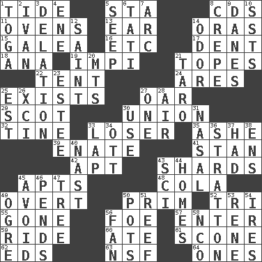 ACROSS 1. Event that recurs at intervals 5. R.R. building 8. Music discs 11. Baking chambers 13. Hearing organ 14. Mouths or openings 15. An organ shaped like a helmet 16. And so on (abbr.) 17. Gouge 18. Santa ___, CA 19. Body of Kaffir warriors 21. Drinks excessively 22. Portable shelter 24. Ancient Greek god of war 25. Is 27. Rowing implement 29. Native of Scotland 30. The state of being joined or united 32. Prong on a fork 33. Failure 35. American tennis player Robert 39. Maternal 41. Comedian Laurel of Laurel & Hardy 42. Fitting 43. Broken pieces 45. Tenement units (abbr.) 48. Root beer relative 49. Unconcealed 50. Demure 52. Three (prefix) 55. Went 56. Enemy 57. Keyboard key 59. Travel on or in a vehicle 60. Had dinner 61. Biscuitlike quick bread 62. Begley and Asner 63. Science/research agcy. 64. Singles DOWN 1. Ancient Roman robe 2. "Terrible" tsar 3. Conveyance 4. Compass dir. 5. Ooze 6. Jacques of French films 7. Curve 8. Streamer paper 9. Natives or inhabitants of Denmark 10. Fast planes 12. Inhabitant of Heaven 14. Aroma 20. Mountains (abbr.) 21. Edible starchy tuberous root 23. First name in cosmetics 25. Eastern Standard Time (abbr.) 26. One more than ninety 27. Single 28. Wind 30. Purpose 31. Relating to the nose 33. Infant locale 34. Baseball player Mel 36. Ski resort town in Vermont 37. Possessed 38. Followers of ems 40. Political cartoonist Thomas 43. _-fi 44. Residences 45. Prevent the occurrence of 46. Hangs 47. Family _ (genealogy) 49. Legendary monster 50. Cooking vessels 51. Coral ridge 53. French philosopher Descartes 54. Angers 56. Air blower 58. Non-commissioned officer (abbr.)