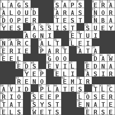 ACROSS 1. Falls behind 5. Plant excrements 9. Epoch 12. Verbally 14. Caspian sea tributary 15. Not either 16. Drug addict 17. Trial 18. Basketball assoc. 19. Affirmative reply 20. Help 23. Chop _ 24. Hindu god of fire 25. Needle holder 27. Drug cop 30. Keyboard modifier key 32. Luau accessory 33. One of the Great Lakes 34. Piece 36. _ moment's notice (2 wds.) 38. Snakelike fish 39. Thick or sticky substance 40. Fool 43. Begley and Asner 46. Morally bad or wrong 48. Pulitzer Prize-winning author Ferber 49. Slangy assent 51. Biblical high priest 52. SW Saudi Arabia district 53. Former U.S. Attorney General Janet 54. Arab leader 56. Enthusiastic 58. Food holders 61. Affectionate concern, for short 64. River (Sp.) 65. Ooze 66. Failure 68. Make lace 69. System (abbr.) 70. Maternal 71. Raised railways 72. Soaks 73. Celtic language DOWN 1. Kenny Rogers chart-topper in '80 2. _ vera 3. Republicans 4. Institute legal proceedings 5. Suttee (variant) 6. Ancient Greek god of war 7. Soft color 8. Fast jet (abbr.) 9. World-weariness 10. Loose flowing garment 11. Like ___ of sunshine 13. To draw with force 21. Fastener 22. Fodder prepared in a silo 23. Set of matching outer garments 24. Adept person 26. Beverage made from leaves 27. Born 28. "We ___ not amused" (Victoria) 29. Cause heat under the collar 31. Collection of objects 35. Rest room 37. Does sums 41. Black tropical American cuckoo 42. Armed conflict 44. Colored 45. Elected rep. 47. Welles in "The Third Man" 48. Hearing organ 50. Wimpy's pal 53. Disturbances 55. Capri or Wright 56. Johnson of "Laugh-In" 57. Small bottle 59. For fear that 60. Tenement units (abbr.) 61. Russian ruler of old 62. Allows 63. Algonquian 65. Compass dir. 67. Single