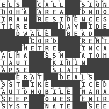 ACROSS 1. Raised railways 4. Give a ring to 8. The Jewish people; Israel 12. Capital of the state of Qatar 14. Length times width 15. Southwest Nigerian state 16. SW Asia republic 17. Homes 20. Hoop that covers a wheel 21. 24 hours 22. Binary compound 23. A sleeping potion; an opiate (poet.) 27. Necklace unit 29. Drawstring 31. Monthly bill 34. Distance measurement (Brit.) 35. South American Indian 36. _ mater 39. Compass dir. 41. Tiny particle 42. Drawn tight 43. Japanese brewing company 46. Domed church section 47. Narrow board 48. Part of Q.E.F. 51. Allots cards 54. Fast jet (abbr.) 56. D.D.E's nickname 58. On the rocks 61. Car 66. Hindu Mythology: god of death 67. Ooze 68. Singles 69. Arab leader 70. System (abbr.) 71. Nathan's nickname 72. Observe DOWN 1. Prepare for publication 2. Australian parrot (variant) 3. Pottery fragment 4. 4-wheeled motor vehicle 5. "We ___ not amused" (Victoria) 6. French article 7. Put down 8. Male child 9. Event 10. Wrote a lyric poem 11. Characteristic smell of wine 13. Afresh 18. Pat or tap gently 19. Sight organ 24. Adept person 25. Car dealer's back yard 26. Blunders 28. Believer in; advocate of (suffix) 30. Writing tables 32. Non-commissioned officer (abbr.) 33. Scottish cap 34. Mother 36. _ moment's notice (2 wds.) 37. Infant locale 38. French bagpipes 40. Rampant 44. Actress Charlotte 45. Call ___ day 49. Direct toward a target or goal 50. Ring climax 52. Welles in "The Third Man" 53. Fraudulent business schemes 54. Backtalk 55. Chop _ 57. Inky black, to poets 59. One of the Great Lakes 60. Have the gumption 62. Elect 63. _ tizzy (2 wds.) 64. Allow 65. Compass dir.