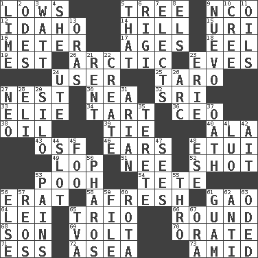 ACROSS 1. Coldest temperatures 5. Family _ (genealogy) 9. Non-commissioned officer (abbr.) 12. Potato state 14. Land elevation 15. RI univ. 16. Distance measurement 17. Matures 18. Snakelike fish 19. Eastern Standard Time (abbr.) 20. Northern region 23. Nights before holidays 24. One who makes use of a thing 25. Edible starchy tuberous root 27. A home for chicks 30. Teachers' org. 32. _ Lanka 33. Writer Wiesel 34. Small pie 36. Corporate head (abbr.) 38. Petroleum 39. Neckwear 40. Insect wing 43. Order of Saint Francis (abbr.) 46. Hearing organs 48. Needle holder 49. Chop off 51. Born 52. Guess 53. "Silly old bear" 54. False hair 56. Part of Q.E.F. 58. Anew 61. E Mali city 64. Flowery wreath 65. Musical group of three 66. Having a circular shape 68. Male offspring 69. Electrical Unit 70. Declaim 71. Double-curved letter 72. Toward the sea 73. Among DOWN 1. Welles in "The Third Man" 2. Lyric poems 3. Electrical Unit 4. A female animal or person 5. Not this but _ 6. Swiss mountan, "Queen of the Mountains" 7. Opts 8. Raised railways 9. New (sp.) 10. Algonquian 11. Lubricates 13. Mouths or openings 21. Monthly bill 22. Cause to be 23. 4th largest of the Great Lakes 24. Shoshoni 26. Curve 27. Modern: prefix 28. Connecticut Ivy Leaguer 29. Grain storage tower 31. Believer in; advocate of (suffix) 35. Cylindrical with tapered ends 37. Pledge 41. Nilotic language 42. Small island 44. Narrow opening 45. Egg _ yung 47. Observes 48. Compass dir. 50. N Egypt peninsula 53. Aches 55. Through, poetically 56. Otherwise 57. Vintage cars 59. Do some clerical work 60. Roll call or roster of names 61. Island territory of the United States 62. Against 63. Wrote a lyric poem 65. Federal power corp. 67. Mouth or opening
