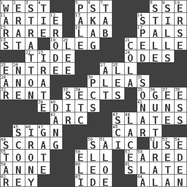 ACROSS 1. Compass direction 5. Pacific Standard Time (abbr.) 8. Compass dir. 11. Nick name for Arthur 13. Alias (abbr.) 14. Move through with a circular motion 15. Less widely known 16. Experiment locale 17. Friends 18. R.R. building 19. Cassini of fashion 21. Cell (Danish) 22. Periodic rise and fall of the sea level 24. Lyric poems 25. Main course 27. 100% 29. Small Philippine buffalo 30. Entreaties 32. Monthly bill 33. Religious groups 35. Double curve, resembling the letter S 39. Prepares for publication 41. Religious women 42. Curve 43. Chalkboards 45. Attach a signature 48. Haul 49. Lean end of the neck 50. Ketch in the Levant 52. Purpose 55. A blast of a horn 56. Pipe bend 57. Having ears or earlike features 59. Singer Murray 60. Lion 61. Chalkboard 62. Marina Del _, California 63. Binary compound 64. Actor Alda or Thicke DOWN 1. Armed conflicts 2. Part of Q.E.F. 3. Ski resort town in Vermont 4. Standoff 5. Diluted with white 6. Heroin 7. Bar bill 8. Lacking originality or spontaneity 9. Beverly of Met fame 10. Celtic language 12. Wear away 14. Moved rapidly 20. Area sheltered from the wind 21. Root beer relative 23. Feeling or showing extreme anger 25. Ewer handle 26. Compass dir. 27. Keyboard modifier key 28. French article 30. Personal Computers (abbr.) 31. Underwater navigation system 33. Title for a knight 34. And so on (abbr.) 36. From the throat 37. Compass dir. 38. Curvy letter 40. Mild oath, euphamism for damn 43. _-fi 44. Shoestrings 45. Biscuitlike quick bread 46. Literary sarcasm 47. Yard entry 49. Play the lead 50. Downhill vehicle 51. _ vera 53. Bristle 54. Genesis locale 56. Biblical high priest 58. Chicken ___ king