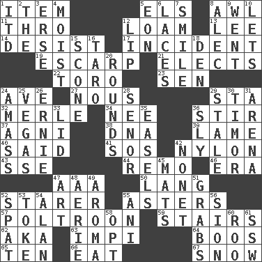 ACROSS 1. A distinct part 5. Raised railways 8. Leather borer 11. Through, poetically 12. Rich soil 13. Area sheltered from the wind 14. Stop 17. Event 19. Fortification 21. Opts 22. "Corrida" creature 23. Elected rep. 24. "___ Maria" 27. Good sense 29. R.R. building 32. Haggard of country music 34. Born 36. Use a swizzle stick 37. Hindu god of fire 38. Heredity factor (abbr.) 39. Unable to walk 40. Alleged 41. Distress signal 42. High-strength synthetic material 43. Compass dir. 44. San ____ (Riviera town) 46. Period 47. American Automobile Association (abbr.) 50. Austrian-born American filmmaker Fritz 52. A viewer who gazes fixedly 55. Michaelmas daisies 57. Coward 59. Flight of steps 62. Alias (abbr.) 63. Body of Kaffir warriors 64. Expressions of contempt or scorn 65. "___ Little Indians" 66. Consume 67. Overwhelm DOWN 1. It would 2. Definite Article 3. Celtic language 4. Wet 5. Period of immesurable duration 6. Shoestrings 7. Grin 8. Actor Baldwin 9. Left 10. Allows 12. Mouth edge 15. Biscuitlike quick bread 16. Pacific island yam 18. Lair 20. Periods in a boxing match 24. Collect or gather 25. Viva Las _ 26. Bert's buddy 28. Sir (Sp.) 29. Having lost freshness 30. Southeast Indonesia island 31. Sports stadium 33. Flaplike covering 35. Artist's stands 36. Mischievous 42. Music written for nine 45. Floor protectors 47. Nonscientific branch of learning 48. Nest on high 49. Scent 51. Catches 52. Petty quarrel 53. Puff or smoke 54. Actor Alda or Thicke 55. Cuckoo 56. The Jewish people; Israel 58. Choose 60. Friend of Pooh 61. Compass dir.