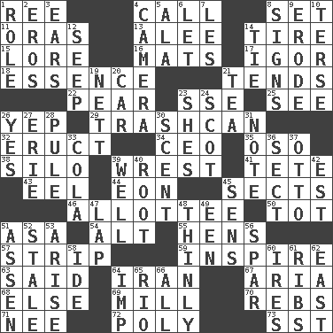 ACROSS 1. Portuguese money of account (variant) 4. Give a ring to 8. Arrange properly for use 11. Mouths or openings 13. Toward shelter 14. Hoop that covers a wheel 15. Old wives' tales, e.g. 16. Floor protectors 17. Composer Stravinsky 18. Substance 21. Is inclined (to) 22. Lightbulb-shaped fruit 23. Compass dir. 25. Observe 26. Slangy assent 29. File 13 32. Spew [out] 34. Corporate head (abbr.) 35. Bear (Spanish) 38. Grain storage tower 39. Obtain by seizing forcibly or violently 41. False hair 43. Snakelike fish 44. A really long time 45. Religious groups 46. One to whom something is allotted 50. Small child 51. White ___ sheet 54. The first octave above the treble staff 55. Coop moms 57. Long narrow piece of something 59. Heighten or intensify 63. Alleged 64. SW Asia republic 67. Roberta Peters solo 68. Otherwise 69. Place where flour is made 70. Confederate soldiers (slang) 71. Born 72. More than one (prefix) 73. Fast jet (abbr.) DOWN 1. Hero or heavy, e.g. 2. Greek god of love 3. Hearing organs 4. Device for capturing images 5. Insect wing 6. Allow 7. French article 8. Signals 9. Wear away 10. Laconic 12. Ooze 14. Neckwear 19. Remaining after all deductions 20. Auto 21. Beverage made from leaves 23. "______ My Girl" (Turtles hit) 24. Highlander 26. It is so 27. 4th largest of the Great Lakes 28. Whine 30. Odor 31. Make mention of 33. Root beer relative 36. Religious group 37. Von Bismarck 39. Not ill 40. Carrot, for example 42. Eastern Standard Time (abbr.) 45. Elected reps. 47. Infant locale 48. Without thickness 49. Car or cant ending 51. NE Netherlands city 52. Having lost freshness 53. Ascend 56. Coast Guard woman 58. Binary compound 60. Angers 61. Chest bones 62. Compass direction 64. Naughty child 65. River (Sp.) 66. Everything