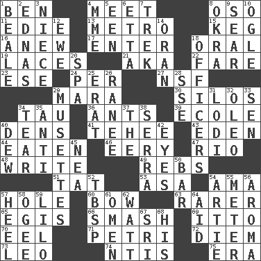 ACROSS 1. Benjamin's nick name 4. Rendezvous 8. Bear (Spanish) 11. Singer Brickell 13. Paris' subway 15. Barrel 16. Afresh 17. Keyboard key 18. Of the mouth 19. Shoestrings 21. Alias (abbr.) 22. Conductor's collection 23. Compass dir. 24. For each 27. Overdraft (abbr.) 29. Hindu Mythology: god of death 30. Grain storage towers 34. The 19th letter of the Greek alphabet 36. Pismires 39. Learning spot: Fr. 40. Habitations of wild animals 41. Giggle 43. Paradise 44. Ingested 46. Suggestive of the supernatural 47. _ de Janeiro 48. Compose 49. Confederate soldiers (slang) 51. Make lace 53. White ___ sheet 54. Housemaid (var.) 57. Hollow 60. Ribbon knot 63. More uncommon 65. The front part of a cuirass 66. Box-office sellout 69. "Tell ____ the Marines!" 70. Snakelike fish 71. _ dish (used to culture cells) 72. South Vietnam president (1954) 73. Lion 74. Nuclear Threat Initiatives 75. Epoch DOWN 1. Calif. Air Force Base 2. Ferber et al. 3. Sibling's daughter 4. Madame (abbr.) 5. Car or cant ending 6. Singer James 7. Long journey 8. Gumbo ingredient 9. Dry up 10. Stare 12. She-sheep 14. Northwest Algerian city 18. Persons of authority 20. Health resort 25. Part of Q.E.F. 26. Indian princess (variant) 28. Compass dir. 29. French bagpipes 31. Farming town in central California 32. Margarine 33. Elected rep. 34. Lacerate 35. Opposed to 37. Definite Article 38. Spanish missionary in California 40. Morning condensation 42. Snake ____ (dice throw) 45. Teachers' org. 50. Oblong piece of solid material 52. Cook's measure (abbr.) 54. Nick name for Arthur 55. Distance measurement 56. Odor 57. Person who is morally reprehensible 58. Double curve, resembling the letter S 59. _ and Stitch 61. Sign of something about to happen 62. Electrical Unit 64. Help 67. Indian title of respect (Mr.) 68. Part of HMS, perhaps