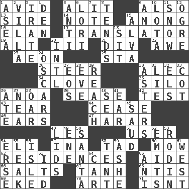 ACROSS 1. Enthusiastic 5. Set down 9. In addition 13. Father 14. Brief written record 15. Amid 16. Liveliness 17. Interpreter 19. Keyboard modifier key 20. One more than two 21. HTML Container Element 22. Deep reverence 23. Age 25. R.R. building 26. Bull 30. Actor Baldwin 34. Garlic unit 35. Grain storage tower 36. Small Philippine buffalo 39. Gospel singer Marvin 42. Trial 43. Pull apart 44. Desist 46. Hearing organs 47. Ethiopian city, capital of Harari 48. French article 51. One who makes use of a thing 54. Biblical high priest 57. _ tizzy (2 wds.) 58. Small boy 60. Cut the grass 62. Dwellings 65. Assistant 66. Table seasonings 67. Hyperbolic tangent 68. Nuclear Threat Initiatives 69. Supplemented with great effort 70. Johnson of "Laugh-In" 71. Is not DOWN 1. Toward the sea 2. Country residence 3. Feeling or showing extreme anger 4. Lair 5. Against 6. Australian parrot (variant) 7. Call ___ day 8. Watches over 9. Housemaid (var.) 10. Globular water bottle used in Asia 11. Frozen precipitation 12. Legendary monster 15. Inventor's middle name 18. Be seated 20. International (abbr.) 24. Motion picture awards 27. Greek goddess of the dawn 28. Night before a holiday 29. Arrive at 30. Michaelmas daisies 31. Whopper 32. Raised railways 33. Small bed 36. Had dinner 37. Teachers' org. 38. Boat paddle 40. Ocean 41. Hearing organ 45. Saudi Arabian king (1953-1964) 48. Flaplike coverings 49. Compass dir. 50. Before Barbara or Clara 52. Gives off 53. "The Thinker" sculptor 54. Celtic language 55. Path through which fluid escapes 56. Capri or Wright 58. Portable shelter 59. American tennis player Robert 61. Compass direction 63. It would 64. 4-wheeled motor vehicle 65. Cuckoo