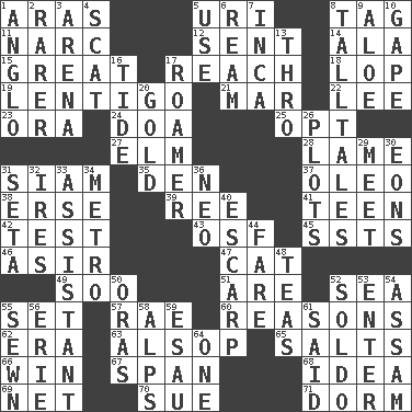 ACROSS 1. Ancient river in northeast Turkey 5. RI univ. 8. Label 11. Drug cop 12. Transmitted 14. Wing 15. Relatively large 17. Arrive at 18. Chop off 19. Small, flat, pigmented spot on the skin 21. Spoil 22. Area sheltered from the wind 23. Mouth or opening 24. ___ good deed 25. Choose 27. Shade tree 28. Unable to walk 31. Thailand, formerly 35. Lair 37. Butter sub 38. Celtic language 39. To riddle 41. Adolescent 42. Trial 43. Order of Saint Francis (abbr.) 45. Fast planes 46. SW Saudi Arabia district 47. Domesticated feline 49. "Barney Miller" actor Jack 51. "We ___ not amused" (Victoria) 52. Ocean 55. Arrange properly for use 57. Actress Charlotte 60. Thinks logically 62. Epoch 63. Columnist Joseph or Stewart 65. Table seasonings 66. Victory 67. Connect, as a bridge 68. The main thing one is thinking about 69. Fish or hair follower 70. Institute legal proceedings 71. Dormintory (informal) DOWN 1. White American of non-Hispanic descent 2. Less widely known 3. Sports stadium 4. Go away! 5. Purpose 6. 480, 500 or 516 sheets of paper 7. South American Indian 8. Baron Munchausen's specialties 9. _ vera 10. Open wide 13. Through, poetically 16. Periodic rise and fall of the sea level 17. Wanderer 20. Gilded 26. Secret plans 29. Rendezvous 30. Immeasurably long periods of time 31. Stalk of a moss capsule 32. Angers 33. Aide 34. Paris' subway 36. Modern: prefix 40. Fortification 44. Conductor's collection 48. Afternoon social gatherings 50. Mouths or openings 52. Twentieth part of a lira 53. Keyboard key 54. Indian state 55. Stitched 56. One of the Great Lakes 58. High mountains 59. Son of Isaac 61. Stated 64. Single