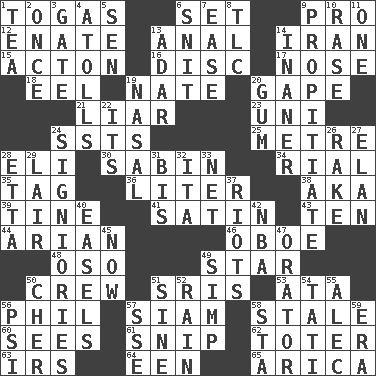 ACROSS 1. Ancient Roman robes 6. Put into a specified state 9. Adept person 12. Maternal 13. Of or related to the anus 14. SW Asia republic 15. NE Massachussets city 16. Compact _ 17. Sense of smell 18. Snakelike fish 19. Nathan's nickname 20. Open wide 21. One who doesn't tell the truth 23. Corn or form start 24. Fast planes 25. Distance measurement (Brit.) 28. Connecticut Ivy Leaguer 30. Unit of acoustic absorption 34. Monetary unit of Yemen 35. Label 36. 61 cubic inches 38. Alias (abbr.) 39. Prong on a fork 41. Smooth fabric 43. "___ Little Indians" 44. Believer in; advocate of (suffix) 46. Mitch Miller's instrument 48. Bear (Spanish) 49. Play the lead 50. Ship's personnel 51. Indian titles of respect 53. _ moment's notice (2 wds.) 56. Silvers or Donahue 57. Thailand, formerly 58. Lacking originality or spontaneity 60. Perceives with the eye 61. Sever or remove by pinching or nipping 62. Carrier 63. Big collection agency 64. Car or cant ending 65. N. Chile seaport DOWN 1. Beverage made from leaves 2. At one time in the past 3. Yard entry 4. Ringlike coral islands and reefs 5. Elected rep. 6. In a ____ (agitated or irritated) 7. Comfort 8. Affectionate concern, for short 9. Conciliate 10. To erase 11. Single 13. The sixth month of the Jewish calendar 14. More empty; more void 19. Rhinal 20. Chewing product 22. ___ a Wonderful Life 24. Seigniories (variant) 26. Immoral or dissolute person 27. Flair 28. Singer James 29. Den 31. Again 32. Call ___ day 33. Fish or hair follower 37. Disturbances 40. Artist's stands 42. Basketball assoc. 45. At this time 47. Speaker 49. Simple or foolish person 50. "Mermaids" star 51. Trig term 52. Precipitation 54. Jacques of French films 55. Actor Baldwin 56. Air pressure measure (abbr.) 57. Compass dir. 58. R.R. building 59. Period