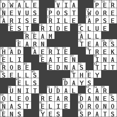 ACROSS 1. A sleeping potion; an opiate (poet.) 6. By way of 9. For each 12. Congenital growth or mark on the skin 13. Mail 14. Had on 15. Ascend 16. Cause heat under the collar 17. Domed church section 18. Eastern Standard Time (abbr.) 19. Travel on or in a vehicle 20. A slight indication 21. 480, 500 or 516 sheets of paper 23. 100% 24. Merit 25. Pulls into pieces 28. Possessed 30. Nest on high 34. Long journey 35. Connecticut Ivy Leaguer 36. Ingested 38. _ tizzy (2 wds.) 39. Loose flowing garment 41. Ferber et al. 43. Teat (slang) 44. Makes a sale 46. Those things 48. Raised railways 49. 24-hour periods 50. A single undivided whole 51. Hereditary estate 53. Auto 56. Margarine 57. Posterior 58. Natives or inhabitants of Denmark 60. Political cartoonist Thomas 61. Writer Wiesel 62. U. of Maine site 63. Followers of ems 64. Affirmative reply 65. Arguments over trivial matters DOWN 1. Heredity factor (abbr.) 2. Past tense of be (plural) 3. Opinion 4. A period of five years 5. Compass dir. 6. State of nonexistence 7. Capri or Wright 8. Had dinner 9. Teen's desire 10. Celtic language 11. Portuguese money of account (variant) 13. Demure 14. Place for singles 19. The wife of a rajah (variant) 20. Domesticated feline 22. Epoch 24. The property of being fit to eat 26. Painter Guido (1575-1642) 27. Three-handed card game 28. Possessive pronoun 29. Medicinal plant 31. Actress Charlotte 32. It would 33. Car or cant ending 37. Brizilian seaport 40. American author Paul (1891-1958) 42. Like a shrinking violet 45. Fast jet (abbr.) 47. Fortification 49. Have the gumption 50. Uhlan (variant) 51. Ubangi River tributary 52. Raised platform 54. Small Philippine buffalo 55. Monthly bill 56. Single 57. Marina Del _, California 58. Two (Sp.) 59. Mayday