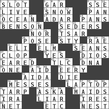 ACROSS 1. Groove 5. Slender fish 8. Compass dir. 11. Not recorded 12. Frozen precipitation 14. Baking dish 15. Sea 17. The sixth month of the Jewish calendar 18. Zero-star reviews 19. Gillaume's butler role 21. Spring feasts 23. And not 25. Russian ruler of old 26. Introduce or present, as a question 27. Filthy place 28. Actress Charlotte 31. Biblical high priest 33. Shade tree 35. Actors Connery and Penn 37. Hoof sound 38. It is so 40. "Vaya con ____" 41. Having ears or earlike features 43. Affectionate concern, for short 45. Heredity factor (abbr.) 46. Single 47. Assist 50. Suggestive of the supernatural 52. Opera by Verdi 53. Pass on 54. Makes clutter 56. Portable computer 61. Canvas cover 62. "____ silly question..." 65. Unmarried girls 66. Retirement account (abbr.) 67. One who doesn't tell the truth 68. Angers 69. Fish or hair follower 70. And so on (abbr.) 71. A home for chicks DOWN 1. Oscar Madison type 2. Louse (plural) 3. Baking chamber 4. Afternoon social gatherings 5. Girls' org. (abbr.) 6. Also 7. Ridicules or criticizes harshly 8. Coast Guard woman 9. Without 10. Followers of ems 13. Obtain by seizing forcibly or violently 16. Words to Nanette 18. For each 20. Characteristic smell of wine 22. 24-hour periods 24. Have confidence or faith in 26. Corncob 28. Precipitation 29. Small Philippine buffalo 30. Curvy letter 31. Flair 32. Old wives' tales, e.g. 34. Was introduced to 36. Whirlpool 37. Corporate head (abbr.) 39. Downhill vehicle 42. Raised platform 44. To provide with a ceiling 48. Perfect 49. Small ungulate mammals of Africa 51. 480, 500 or 516 sheets of paper 52. Viper 54. Female horse 55. Part of Q.E.F. 57. Ache 58. Become fatigued 59. Lyric poems 60. Inconspicuous attention getter 61. Metal container 63. Krazy ___ of comics 64. Curve