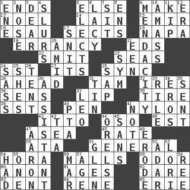 ACROSS 1. Conclusions 5. Otherwise 9. Create 13. Christmas carol 14. (Had) reclined 15. Independent ruler or chieftain 16. Son of Isaac 17. Religious groups 18. California wine valley 19. Tendancy to err 21. Begley and Asner 22. Stricken, poetically 23. Oceans 24. Fast jet (abbr.) 27. It is 28. Synchronize (abbr.) 29. Having the leading position 31. Scottish cap 32. Angers 36. Elected reps. 37. Mouth edge 38. Hoop that covers a wheel 39. Fast planes 40. Writing instrument 41. Thermoplastic polyamide 42. "Tell ____ the Marines!" 44. Bear (Spanish) 46. Eastern Standard Time (abbr.) 47. At sea 48. Pace 50. _ moment's notice (2 wds.) 51. Commissioned military rank 54. Israeli folk dance 56. Shopping centers 58. Scent 60. At once, immediately (arch.) 61. Matures 62. Have the gumption 63. Incision 64. French philosopher Descartes 65. 4th largest of the Great Lakes DOWN 1. Compass dir. 2. Olfactory organ 3. Letter starter 4. Disparaging remarks 5. Opts 6. Made of lace 7. Be seated 8. Followers of ems 9. Ananias' fault 10. Collect or gather 11. Sleep 12. Period 17. In a ____ (agitated or irritated) 20. Among 21. Car or cant ending 23. Symbol (abbr.) 24. Backtalk 25. "______ My Girl" (Turtles hit) 26. Portable shelter 28. Plant excrement 30. Aide 31. Metal container 33. Cause heat under the collar 34. Greek god of love 35. Transmitted 37. Lion 40. Parent Teacher Assoc. 41. Brief written record 43. Beverage made from leaves 44. Threatening words 45. Without 47. Composer Copland 49. Wear away 51. Small, secluded valley 52. The sixth month of the Jewish calendar 53. Australian parrot (variant) 54. Possessed 55. Single 56. Make imperfect 57. Grow older 59. To sift
