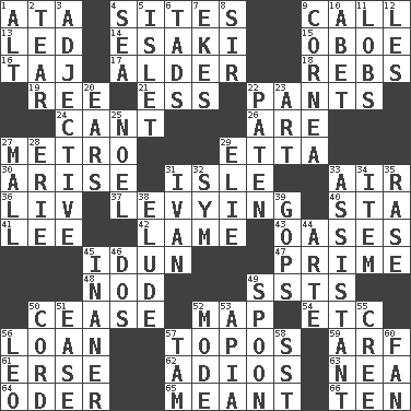 ACROSS 1. _ moment's notice (2 wds.) 4. Settings 9. Give a ring to 13. Directed 14. 1973 Nobel Price Winner (Physics) Leo 15. Mitch Miller's instrument 16. _ Mahal 17. Tree or shrub in the Birch family 18. Confederate soldiers (slang) 19. To sift 21. Curvy letter 22. Leg coverings 24. Patter 26. "We ___ not amused" (Victoria) 27. Paris' subway 29. Singer James 30. Ascend 31. Capri or Wright 33. Atmosphere 36. 54 in ancient Rome 37. Imposing or collecting, as a tax 40. R.R. building 41. Area sheltered from the wind 42. Unable to walk 43. Fertile tracts in a desert 45. Goddess of spring and wife of Bragi 47. First class 48. Dreamland 49. Fast planes 50. Desist 52. Atlas unit 54. And so on (abbr.) 56. Grant temporary use of 57. Literary convention 59. Sandy's bark 61. Celtic language 62. Goodbye (Sp.) 63. Teachers' org. 64. Baltic tributary 65. Intended 66. Nine, plus one DOWN 1. The first octave above the treble staff 2. Separate forcefully 3. Descriptive word 4. Ocean 5. Small island 6. Bits 7. Makes supply last 8. Title for a knight 9. Pupil covering 10. Collude with 11. Tennis shots 12. French article 20. Hearing organs 22. Eucharist need 23. Tate display 25. Christmas carol 27. Promenade 28. 4th largest of the Great Lakes 29. Writer Wiesel 31. _ the terrible 32. Symbol (abbr.) 33. Helper 34. Detail 35. To erase 38. Evade 39. Republicans 44. Johnson of "Laugh-In" 45. More lacking in sense or substance 46. Two (Sp.) 49. Soup utensil 50. Drawstring 51. Relaxation 52. Method 53. Capital of Western Samoa 55. Algonquian 56. Lion 57. Scottish cap 58. Fast jet (abbr.) 60. Avid follower