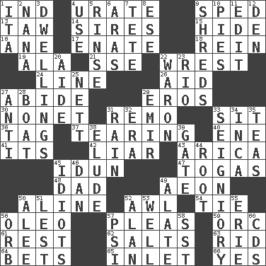 ACROSS 1. Working for oneself (abbr.) 4. A salt of uric acid 9. Hurried 13. The 23rd letter of the Hebrew alphabet 14. Titles for men of rank and authority 15. Flintstone garb 16. One (Scot) 17. Maternal 18. It's straight from the horse's mouth 19. In the manner of 21. Compass dir. 22. Obtain by seizing forcibly or violently 24. Actor's bit 26. Assist 27. Remain 29. Greek god of love 30. Music written for nine 31. San ____ (Riviera town) 33. Be seated 36. Label 37. Separating forcefully 40. Compass dir. 41. It is 42. One who doesn't tell the truth 43. N. Chile seaport 45. Goddess of spring and wife of Bragi 47. Ancient Roman robes 48. June honoree 49. Age 50. Place in a line 52. Leather borer 54. Standoff 56. Margarine 57. Entreaties 59. The grampus (Milton) 61. Relief 62. Table seasonings 63. To free from 64. Stakes 65. An arm off of a larger body of water 66. Consenting reply DOWN 1. Call ___ day 2. Grandmother 3. Residences 4. Purpose 5. Wash lightly 6. Caspian sea tributary 7. False hair 8. Compass dir. 9. Tears up 10. Sliced desserts 11. Prepare for publication 12. Lair 20. Assistant 22. Make _____ (do battle with) 23. _ de Janeiro 25. Remaining after all deductions 27. Against 28. Water vessel 29. Independent ruler or chieftain 31. Water falling in drops from the sky 32. Epoch 33. Signiory (variant) 34. South American Indian 35. Afternoon social gatherings 38. Dodge 39. Yard entry 44. Carrot, for example 45. Foolish or stupid persons 46. One of the 12 tribes of Israel 49. Having winglike extensions 50. Toward shelter 51. For fear that 52. ____ Jay Lerner 53. Not ill 55. 4th largest of the Great Lakes 56. Globe 57. Air pressure measure (abbr.) 58. Fast jet (abbr.) 60. Music discs