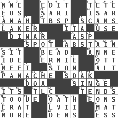 ACROSS 1. Compass dir. 4. Prepare for publication 8. Wig 12. Greek goddess of the dawn 13. Indian skirt 14. Austrian river, tributary to the Danube 15. Nanny 17. Cook's measure (abbr.) 18. Fraudulent business schemes 19. Member of a famous L.A. basketball team 21. Call ___ day 23. Purpose 24. Middle Eastern gold or silver currency 26. Cleo's killer 28. Specific locale 30. Refrain by choice 34. Be seated 37. Necklace unit 39. Singer Murray 40. Binary compound 41. Bert's buddy 43. Baseball player Mel 44. Rendezvous 46. The Jewish people; Israel 47. The first octave above the treble staff 48. Flamboyance 51. Neighbor of Neb. 54. ___ good deed 55. Scorch 58. It is 61. Affectionate concern, for short 63. Looks after 65. Woman's close-fitting hat 67. Pledge 71. Immeasurably long periods of time 72. Part of Q.E.F. 73. 57 in ancient Rome 74. Floor covering 75. Greater amount 76. Lairs 77. Double-curved letter DOWN 1. Be tempered by heat 2. Roamer 3. 1973 Nobel Price Winner (Physics) Leo 4. Eastern Standard Time (abbr.) 5. Small moist lump or mass 6. Big collection agency 7. Native american tent (variation) 8. Nervous spasm 9. Son of Isaac 10. Scottish caps 11. Celtic language 16. Coop moms 18. Backtalk 20. Strike 22. Keyboard key 25. Loose flowing garment 27. Parent Teacher Association (abbr.) 29. Laconic 30. Goodbye (Sp.) 31. Small Philippine buffalo 32. International (abbr.) 33. Remaining after all deductions 34. Simple or foolish person 35. It may be bright or harebrained 36. Adolescent 38. Black tropical American cuckoo 42. Extremities 45. Small amount or degree 49. ____ d'Azur (French Riviera) 50. Actor Linden 52. Small island 53. Leg joint 56. Dwarf 57. Ferber et al. 58. A whole individual unit 59. "Corrida" creature 60. Fly high 62. Lacking warmth 64. Fast planes 66. Shoshoni 68. "___ Maria" 69. Metal container 70. Part of HMS, perhaps