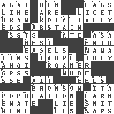 ACROSS 1. Blind as ____ 5. Benjamin's nick name 8. Fails to keep up a pace 12. Welles in "The Third Man" 13. "We ___ not amused" (Victoria) 14. It is permitted: Lat. 15. Northwest Algerian city 16. Happening in regular succession 19. Begley and Asner 20. Refrain by choice 21. Fast planes 23. Had dinner 24. White ___ sheet 27. Command 30. Arab leader 31. Artist's stands 34. Grandmother 35. Airtight sealed metal containers 38. Grayish beige 40. Those people 41. Mine, in Marseilles 42. Wanderer 44. Global Positioning Systems (abbr.) 45. Unadorned 46. Compass dir. 47. Small island 50. Snakelike fish 53. "Death Wish" actor 57. Call ___ day 59. Census information 63. Merit 64. Related on the mother's side 65. Whopper 66. In a ____ (agitated or irritated) 67. French philosopher Descartes 68. Raised railways 69. Plant excrements DOWN 1. Medicinal plant 2. Avian creatures 3. Collect or gather 4. "___ Little Indians" 5. Sharp remark 6. Greek god of love 7. Remaining after all deductions 8. 54 in ancient Rome 9. Adept person 10. Set 11. Filthy place 14. Actor's bit 17. American Automobile Association (abbr.) 18. Teat (slang) 20. At sea 22. College paper 24. Housemaid 25. Trig term 26. Like ___ of sunshine 28. Fast jet (abbr.) 29. Lacerate 30. Main course 32. Nilotic language 33. Connect, as a bridge 35. Labels 36. Naughty children 37. Olfactory organ 39. Australian flightless bird 43. Locale of original sin 47. Competent 48. Lyricist Gershwin 49. Small child 51. Climbing, woody, usually tropical vines 52. Long narrow piece of something 54. Mediterranean tributary 55. Land 56. Washington bills 58. Pismires 59. For each 60. Single 61. Baking dish 62. Shoshoni 63. Double-curved letter