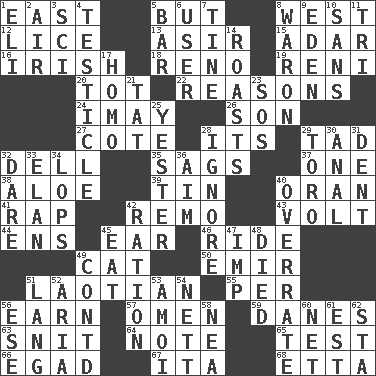 ACROSS 1. 90 degrees 5. With the exception that 8. 270 degrees 12. Louse (plural) 13. SW Saudi Arabia district 15. The sixth month of the Jewish calendar 16. From or relating to Ireland 18. Western Nevada city 19. Painter Guido (1575-1642) 20. Small child 22. Thinks logically 24. "If ____ say so..." 26. Male child 27. ____ d'Azur (French Riviera) 28. It is 29. Small amount or degree 32. Small valley 35. Sinks 37. Single 38. _ vera 39. Shallow baking pan 40. NW Algerian seaport 41. Hit sharply and swiftly 42. San ____ (Riviera town) 43. Electrical Unit 44. Followers of ems 45. Hearing organ 46. Travel on an animal 49. Feline 50. Arab leader 51. Of or relating to Laos or its people 55. For each 56. Merit 57. Sign of things to come 59. Natives or inhabitants of Denmark 63. In a ____ (agitated or irritated) 64. Observe 65. Trial 66. Mild oath 67. Call ___ day 68. Singer James DOWN 1. Connecticut Ivy Leaguer 2. Atmosphere 3. _-fi 4. One of the two male reproductive glands 5. Tavern 6. One who uses or employs something 7. Prong on a fork 8. Make _____ (do battle with) 9. Paradise 10. Without 11. Three (prefix) 14. Exposes to great heat 17. Like (prefix) 21. Make lace 23. Mayday 25. Last 28. Refuse to acknowledge 29. "Corrida" creature 30. Of or related to the anus 31. Gouge 32. Have the gumption 33. Liveliness 34. Chops off 36. Direct toward a target or goal 40. Make much ado about nothing 42. Food allowance for one day 45. Consume 47. Naughty child 48. Passed on 49. Continued (abbr.) 51. Austrian-born American filmmaker Fritz 52. Roberta Peters solo 53. Mine, in Marseilles 54. Remaining after all deductions 56. Compass dir. 58. Teachers' org. 60. Fish or hair follower 61. Eastern Standard Time (abbr.) 62. R.R. building