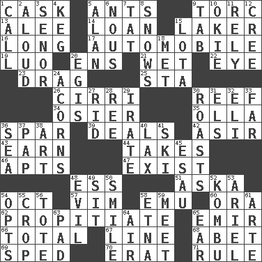 ACROSS 1. Keg 5. Pismires 9. Torque (variant) 13. Toward shelter 14. Grant temporary use of 15. Member of a famous L.A. basketball team 16. Yearn 17. Form of transportation 19. Nilotic language 20. Followers of ems 21. Soggy 22. Sight organ 23. To trail on the ground 25. R.R. building 26. High-altitude cloud 30. Coral collection 34. Flexible twig of a willow tree 35. Water jar 36. Coast Guard woman 39. Allots cards 42. SW Saudi Arabia district 43. Merit 44. Proceeds 46. Tenement units (abbr.) 47. Be 48. Curvy letter 51. "____ silly question..." 54. Sep. follower 57. Zeal 58. Australian flightless bird 60. Mouth or opening 62. Appease 65. Independent ruler or chieftain 66. Add up to 67. Actor's bit 68. Collude with 69. Moved rapidly 70. Part of Q.E.F. 71. General guideline DOWN 1. Give a ring to 2. Verbally 3. Sir (Sp.) 4. Cask 5. Actor Alda or Thicke 6. Common sense 7. Make lace 8. Overwhelms 9. Bar bill 10. Migrant worker of the '30s 11. Have confidence or faith in 12. Algonquian 15. Globular water bottle used in Asia 18. Was introduced to 20. Armor plate that protects the chest 24. Oak nuts 27. To free from 28. Portuguese money of account (variant) 29. Feeling or showing extreme anger 30. Exposes to great heat 31. Raised railways 32. Biblical high priest 33. At a great distance 36. Ocean 37. Infant food 38. Tate display 40. Not strict 41. What Jean-Claude Killy likes to do 45. He sold his birthright 48. Tending to cause great harm 49. Be seated 50. Grin 52. Dried seaweed eaten as food 53. Satellite of Uranus 54. Elects 55. Riding implement 56. Lug 58. Inactive volcano in Sicily 59. Confront 61. Johnson of "Laugh-In" 63. Writing tablet 64. Wind 65. Ewer handle