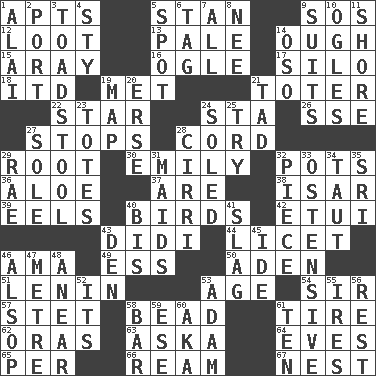 ACROSS 1. Tenement units (abbr.) 5. Comedian Laurel of Laurel & Hardy 9. Distress signal 12. Spoils 13. Diluted with white 14. Ending for "Through" and "Enough" 15. Like ___ of sunshine 16. Stare at amorously 17. Grain storage tower 18. It would 19. Was introduced to 21. Carrier 22. Play the lead 24. R.R. building 26. Compass dir. 27. Halts 28. Drawstring 29. Carrot, for example 30. Poet Dickinson 32. Cooking vessels 36. _ vera 37. "We ___ not amused" (Victoria) 38. Austrian river, tributary to the Danube 39. Snakelike fish 40. Avian creatures 42. Needle holder 43. "You Light Up My Life" star Conn 44. It is permitted: Lat. 46. Wet nurse (var.) 49. Curvy letter 50. An important port of Yemen 51. Soviet premier 1918-24 53. Personal question 54. Title for a knight 57. Proofreading order 58. Necklace unit 61. Become fatigued 62. Mouths or openings 63. "____ silly question..." 64. Nights before holidays 65. For each 66. 480, 500 or 516 sheets of paper 67. A home for chicks DOWN 1. Mountain range southwest of Kyrgyzstan 2. Left side of a ship or aircraft 3. Inedible or poisonous agaric 4. Filthy place 5. Blemish 6. Label 7. Everything 8. Born 9. Sets of matching outer garments 10. Stares 11. Dinah or Pauly 14. Bear (Spanish) 19. Atlas unit 20. Celtic language 21. Small boy 23. Lugs 24. Having a sole or soles 25. Attempt 27. Not divided or shared with others 28. High-altitude cloud 29. Actress Charlotte 31. Unmarried girls 32. Component 33. Clearly or manifestly demonstrative 34. Drawn tight 35. Indian title of respect (Mr.) 40. Again 41. Volcanic refuse 43. Lair 45. Binary compound 46. Columnist Joseph or Stewart 47. Distance measurement (Brit.) 48. Approach 52. ___ a Wonderful Life 53. First of billions? 55. Angers 56. Remainder 58. Soap unit 59. Compass dir. 60. Alias (abbr.) 61. "___ Little Indians"