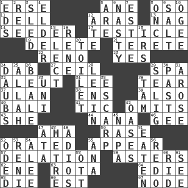 ACROSS 1. Celtic language 5. One (Scot) 8. Bear (Spanish) 11. Small valley 12. Caspian sea tributary 13. Tired old horse 14. Sowing specialist 17. One of the two male reproductive glands 19. Keyboard key 21. Cigar-shaped 22. Western Nevada city 23. Affirmative reply 24. Pat or tap gently 27. To provide with a ceiling 29. Health resort 32. Eskimo relative 34. Area sheltered from the wind 36. Lacerate 37. Uhlan (variant) 38. Followers of ems 39. In addition 40. Indonesian resort city 41. Nervous spasm 42. Leaves out 43. A female animal or person 44. Grandmother 46. Turn to the right 47. Nursemaid (var.) 50. Raze (variant) 52. Spoke pompously 55. Become visible 57. Conveyance 59. Michaelmas daisies 62. Compass dir. 63. Round or rotation of duties 64. Singer Brickell 65. Expire 66. Eastern Standard Time (abbr.) 67. Thickened enlargement DOWN 1. Begley and Asner 2. To separate or throw off 3. Downhill vehicle 4. A person who is older than you are 5. "We ___ not amused" (Victoria) 6. Characterized by obscenity 7. First name in cosmetics 8. Single time 9. Table seasoning 10. Double curve, resembling the letter S 12. Had dinner 15. Opt 16. French philosopher Descartes 18. Big collection agency 20. Bathroom plumbing fixture 24. Applies to a surface 25. Assad's deity 26. Memphis, Tenn. Street 28. Soviet premier 1918-24 29. Major League Baseball Commissioner Bud 30. Thick mixture 31. Came up 33. Corn or form start 35. Fortification 36. Scottish cap 42. Fertile tracts in a desert 45. California wine valley 47. _ moment's notice (2 wds.) 48. Distance measurement (Brit.) 49. Goodbye (Sp.) 51. Eroded 52. Wrote a lyric poem 53. Painter Guido (1575-1642) 54. Toward shelter 55. Santa ___, CA 56. Redecorate 58. Baseball player Mel 60. To free from 61. Perceive with the eye