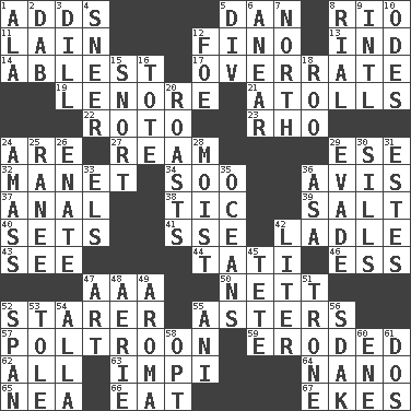 ACROSS 1. Does sums 5. One of the 12 tribes of Israel 8. _ de Janeiro 11. (Had) reclined 12. A pale, very dry sherry 13. Working for oneself (abbr.) 14. Most capable 17. Make much ado about nothing 19. Poe poem 21. Ringlike coral islands and reefs 22. Printing process, for short 23. 17th letter of the Greek alphabet 24. "We ___ not amused" (Victoria) 27. 480, 500 or 516 sheets of paper 29. Compass dir. 32. French painter Edouard 34. "Barney Miller" actor Jack 36. Opinion 37. Of or related to the anus 38. Nervous spasm 39. Table seasoning 40. Arranges properly for use 41. Compass dir. 42. Dipping utensil 43. Perceive with the eye 44. Jacques of French films 46. Double-curved letter 47. Auto club (abbr.) 50. Remaining after all deductions 52. A viewer who gazes fixedly 55. Michaelmas daisies 57. Coward 59. Worn away 62. Everything 63. Body of Kaffir warriors 64. Billionth: prefix 65. Teachers' org. 66. Ingest 67. Makes supply last DOWN 1. Chicken ___ king 2. Small moist lump or mass 3. Deli pickle 4. Scornful expression 5. HTML Container Element 6. Approach 7. _ pole 8. Monetary unit of Yemen 9. International (abbr.) 10. Lyric poems 12. Enemy 15. Derisive sound 16. Carry 18. Friend of Pooh 20. Cooks with dry heat, as in an oven 24. Collect or gather 25. The wife of a rajah (variant) 26. Related on the mother's side 28. Wet 29. Dodge 30. Beverly of Met fame 31. _____ Park, CO 33. Raised railways 35. Seas 36. White ___ sheet 42. 61 cubic inches 45. False hair 47. Nonscientific branch of learning 48. Nest on high 49. Odor 51. Heavy duty weighing machine 52. Connect, as a bridge 53. Lacquered or enameled metalware 54. Silent film actress Nazimova 55. Cuckoo 56. Neighbor of Neb. 58. Choose 60. Compass dir. 61. Two (Sp.)