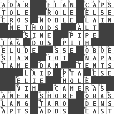 ACROSS 1. The sixth month of the Jewish calendar 5. Liveliness 9. Balmoral and tarboosh 13. Lacquered or enameled metalware 14. Hero or heavy, e.g. 15. Otherwise 16. Greek god of love 17. Having high moral qualities 18. (Had) reclined 19. Modes 21. Keyboard modifier key 22. Trig term 23. Corncob 24. Label 27. Two (Sp.) 28. Essential or central part 29. Dodge 31. Compass dir. 32. Mitch Miller's instrument 36. Cole _ (cabbage dish) 37. Small child 38. California wine valley 39. Docile 40. One of the 12 tribes of Israel 41. Portable shelters 42. Put down 44. Parent Teacher Association (abbr.) 46. Compass dir. 47. Writer Wiesel 48. Hollow 50. Zeal 51. Devices for capturing images 54. So be it 56. Dinah or Pauly 58. Mouths or openings 60. Long (Scottish) 61. Pacific island yam 62. Hiding places for outlaws 63. Tenement units (abbr.) 64. Sums up 65. 90 degrees DOWN 1. Had dinner 2. Dormintory (informal) 3. _ vera 4. Musical pauses 5. Eats (away) 6. Tennis shots 7. 100% 8. Born 9. Portable communications device 10. Having winglike extensions 11. 23rd letter of the Greek alphabet 12. Elected rep. 17. Words to Nanette 20. Flintstone garb 21. Small island 23. Sliced dessert 24. Trial 25. Silent film actress Nazimova 26. Island territory of the United States 28. Pacific Standard Time (abbr.) 30. Residences 31. Boy, to dad 33. Object of repulsion 34. Chooses 35. Comfort 37. Small amount or degree 40. Expire 41. Falsehood 43. Direct toward a target or goal 44. N Egypt peninsula 45. Heavy book 47. Happening 49. Wear away 51. Drawstring 52. Type of rug 53. Without 54. According to 55. Atlas unit 56. R.R. building 57. Possessed 59. Fast jet (abbr.)