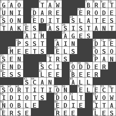 ACROSS 1. E Mali city 4. The 23rd letter of the Hebrew alphabet 7. Cy Young winner Saberhagen 11. Single; one (prefix) 12. Have the gumption 13. Wear away 14. Male offspring 15. Prepare for publication 16. Chalkboards 17. Receives possession of 19. Helper 21. Direct toward a target or goal 23. Matures 24. Inconspicuous attention getter 25. The 18th letter of the Arabic alphabet 26. Pass on 29. Confronts 30. Raised railways 31. Bear (Spanish) 32. Elected rep. 33. Big collection agency 34. Baking dish 35. Conclusion 36. _-fi 37. More peculiar 40. Curvy letter 41. Area sheltered from the wind 42. Fermented drink made from hops 43. Examine hastily 45. Everything 46. Conclusion 51. Voters do this 55. Foolish or stupid persons 56. Dunce 58. Solemn pledge 59. Impressive in appearance 60. Singer Brickell 61. Call ___ day 62. Celtic language 63. To sift 64. French article DOWN 1. Abrupt rush of wind 2. Small Philippine buffalo 3. Pig sound 4. Bit 5. Roberta Peters solo 6. Moistens 7. Naughty children 8. Roll call or roster of names 9. Genesis locale 10. Trial 12. Cease 13. Otherwise 16. Signals 18. Relaxation 20. Moves on water 22. Mountains (abbr.) 24. Hangs 25. Nest on high 26. Drug addict 27. Austrian river, tributary to the Danube 28. Age 29. Not women's 32. Perceive with the eye 33. Ancient Celtic tribe of eastern Britain 36. Narrow boards 37. Chief or king in Benin or Nigeria 38. Erase 39. Small valley 43. Fur scarf 44. Quote 46. Trig term 47. Scent 48. Teases 49. Baltic tributary 50. Connecting point 52. Morally bad or wrong 53. ____ d'Azur (French Riviera) 54. It was, poetically 57. Untruth