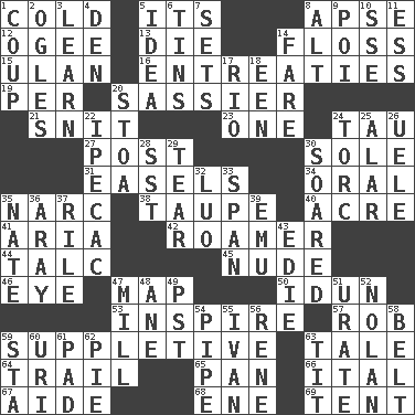 ACROSS 1. Having a low temperature 5. ___ a Wonderful Life 8. Domed church section 12. Double curve, resembling the letter S 13. Pass on 14. Soft thread for cleaning between teeth 15. ____ Bator, Mongolia 16. Pleas 19. For each 20. More lively and spirited 21. In a ____ (agitated or irritated) 23. Single 24. The 19th letter of the Greek alphabet 27. Mail 30. Not divided or shared with others 31. Artist's stands 34. Taken by mouth 35. Drug cop 38. Grayish beige 40. Land measure 41. Roberta Peters solo 42. Nomad 44. Baby powder 45. Unadorned 46. Sight organ 47. Atlas unit 50. Goddess of spring and wife of Bragi 53. Stimulate to action 57. Director Reiner 59. Supplementary 63. Story 64. Drop behind 65. Baking dish 66. Slanted text style (abbr.) 67. Assistant 68. Compass dir. 69. Portable shelter DOWN 1. Overturn; upset 2. Stares at amorously 3. Memorize 4. Lair 5. The content of cognition 6. Canisters 7. Arranges properly for use 8. The first octave above the treble staff 9. Luau course 10. Compass dir. 11. Curvy letter 14. Conductor's collection 17. _ de Janeiro 18. Car or cant ending 20. Portico 22. Medicinal drug used to evoke vomiting 24. Torque (variant) 25. Having or resembling wings 26. Ubangi River tributary 28. Fast jet (abbr.) 29. Rend 30. Flew 32. Nilotic language 33. Connect, as a bridge 35. Nathan's nickname 36. Like ___ of sunshine 37. Cause heat under the collar 39. Australian flightless bird 43. Singer Brickell 47. Place where flour is made 48. A saturated hydrocarbon 49. Pacific Standard Time (abbr.) 51. A salt of uric acid 52. Pitcher Ryan 54. Corncob 55. _ the terrible 56. French philosopher Descartes 58. Waist strap 59. R.R. building 60. RI univ. 61. Writing tablet 62. Sliced dessert 63. Teat (slang)